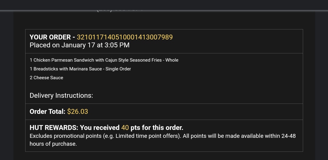 The pizza was fresh, my chicken was not. As a result of the time spent waiting I had to go back to work and did not get a chance to eat my meal other than what I ate on the drive