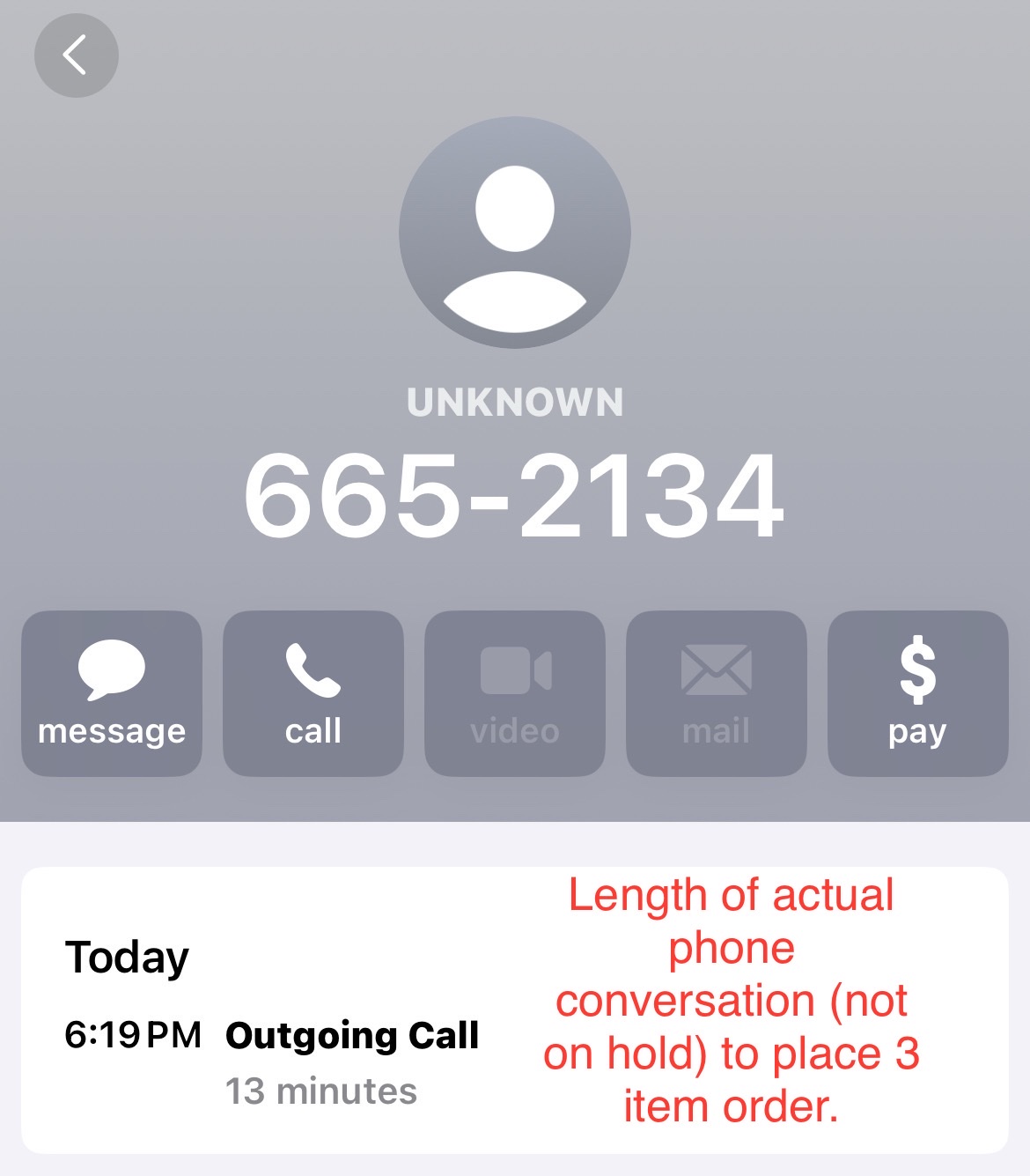 Phone order time: 6:19pm - 6:32pm. That’s 13 mins. I wasn’t placed on hold. It was an actual 13 min phone conversation to place a 3 item order.