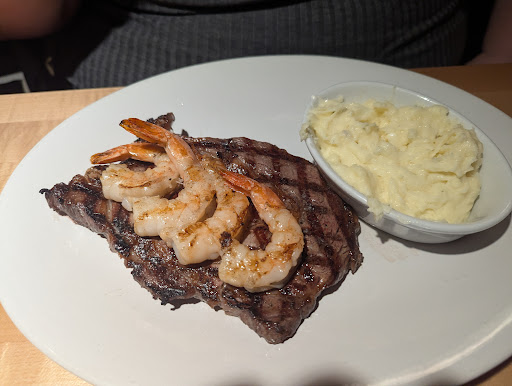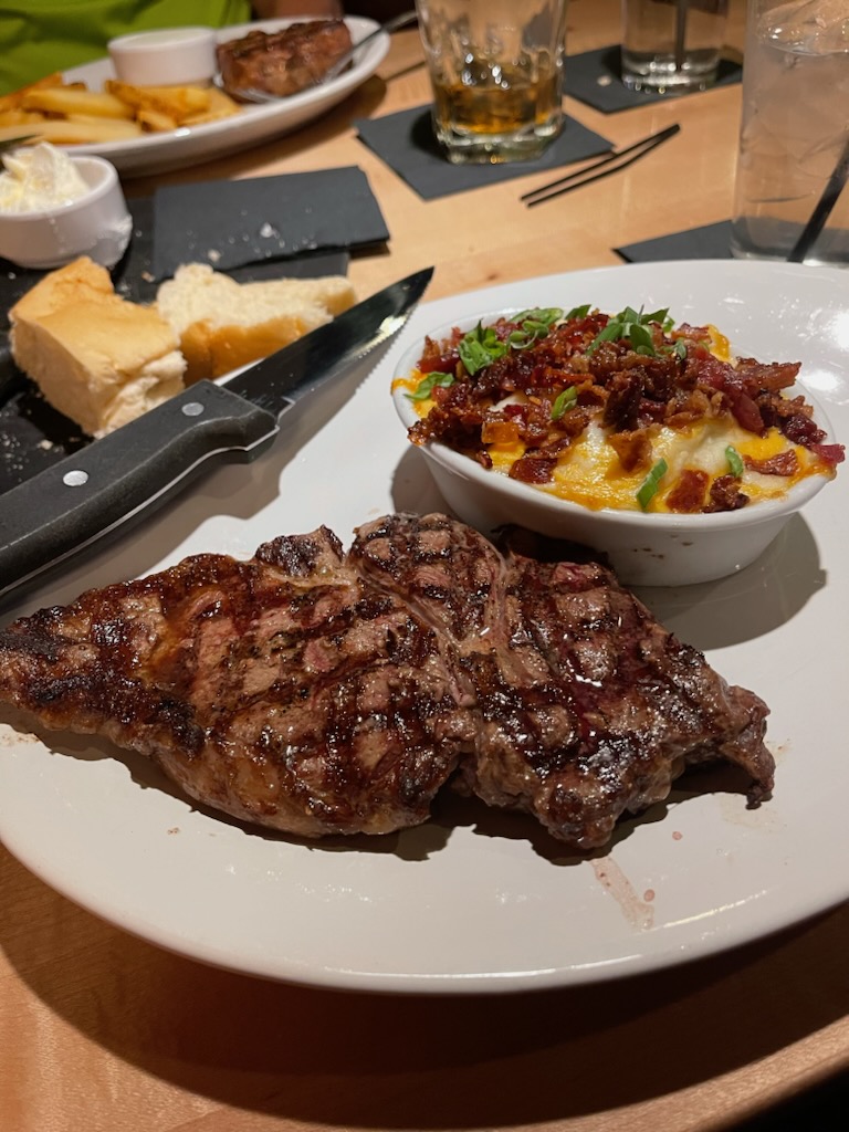 I ordered an 8 oz filet, with the De Burgo and mushrooms options, and for my sides I got the Boursin mashed potatoes and the Philly steak and cheese soup. My wife got the small ribeye with the marinated shrimp skewer, and for her sides she also had the Boursin mashed potatoes but with a side salad.
