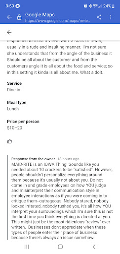 Read moreStopped by Maid-Rite, Ankeny, for what we thought would be a nice quick lunch and it was anything but that. My friends lunch was delivered within minutes but apparently because I ordered onion rings, my took between 15-20 minutes longer. The reason I was given, by the manager, was because they hand make them! Ive made onion ring before so not sure why it took so long. My friend had finished her lunch while I was still waiting so I asked that mine be packed up to go. By the time I got back to DSM, the bun on my maid-rite was so soggy it wasn't edible and to add insult to injury, the onion rings that I waited so long for we're so salty I couldn't even eat them! That was $11.00 down the drain! I'm not sure what is going on with establishment but the last two times I've been here, the place could use some cleaning. The last time my shoes almost came off me feet since the floor was so sticky and this time the drink station was a nasty mess and looked like it had not been wiped down for some time. I did bring this to the attention of a server who merely looked at it and picked up a couple of straw paper. This is my last time going to this...