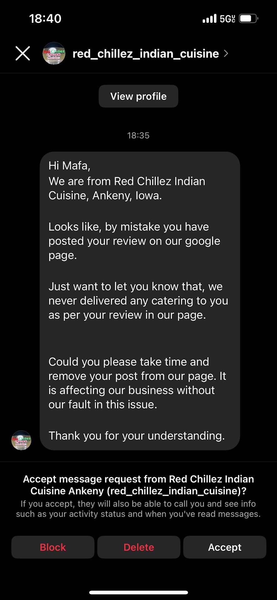 Read moreI have been wishing for an Indian restaurant in Ankeny for forever and Red Chillez completely exceeded what I had hoped for! For being less than 30 days old, they are knocking it out of the park. The best part was the service--everyone we interacted with was friendly, helpful, and showed they really cared about the quality of their food and the quality of our experience. The decor, seating, tables are comfortable, tasteful, and a bit high-end feeling without being stuffy. The food was delicious and came out quickly and piping hot. Apologies on the sub-par photos--I forgot to take them until we had already started digging in. Spice levels are listed on the menu and the server asks each person what they prefer. The Lamb Korma (19.99) was fantastic with lots of large chunks of perfectly tender meat (I always feel like meat is scarce in these types of dishes--this one had at least 3 times more meat than other restaurants), plenty of perfectly-seasoned gravy, and exactly what I wanted for mild spice level, just a hint of heat. The Malai Kabab (14.99) had a nice herby and slightly lemony coating, was tender and moist, and came with a nice herb and lemon dipping sauce. That one was ordered with medium heat and we shared with the waiter that we would have expected a little more heat for medium. The Garlic Naan ($4.99) was to die for. Both main dishes were enough for 2 meals each, making their prices extremely reasonable. A big bowl of rice (not pictured) came with each meal and we were offered more. The prices for each of the 3 items we ordered were the same or only $1 more than the closest competitor in Bondurant, but the amount of food was at least 50% more and service, dining experience, and food quality was well above. Can't wait to go back and try more...