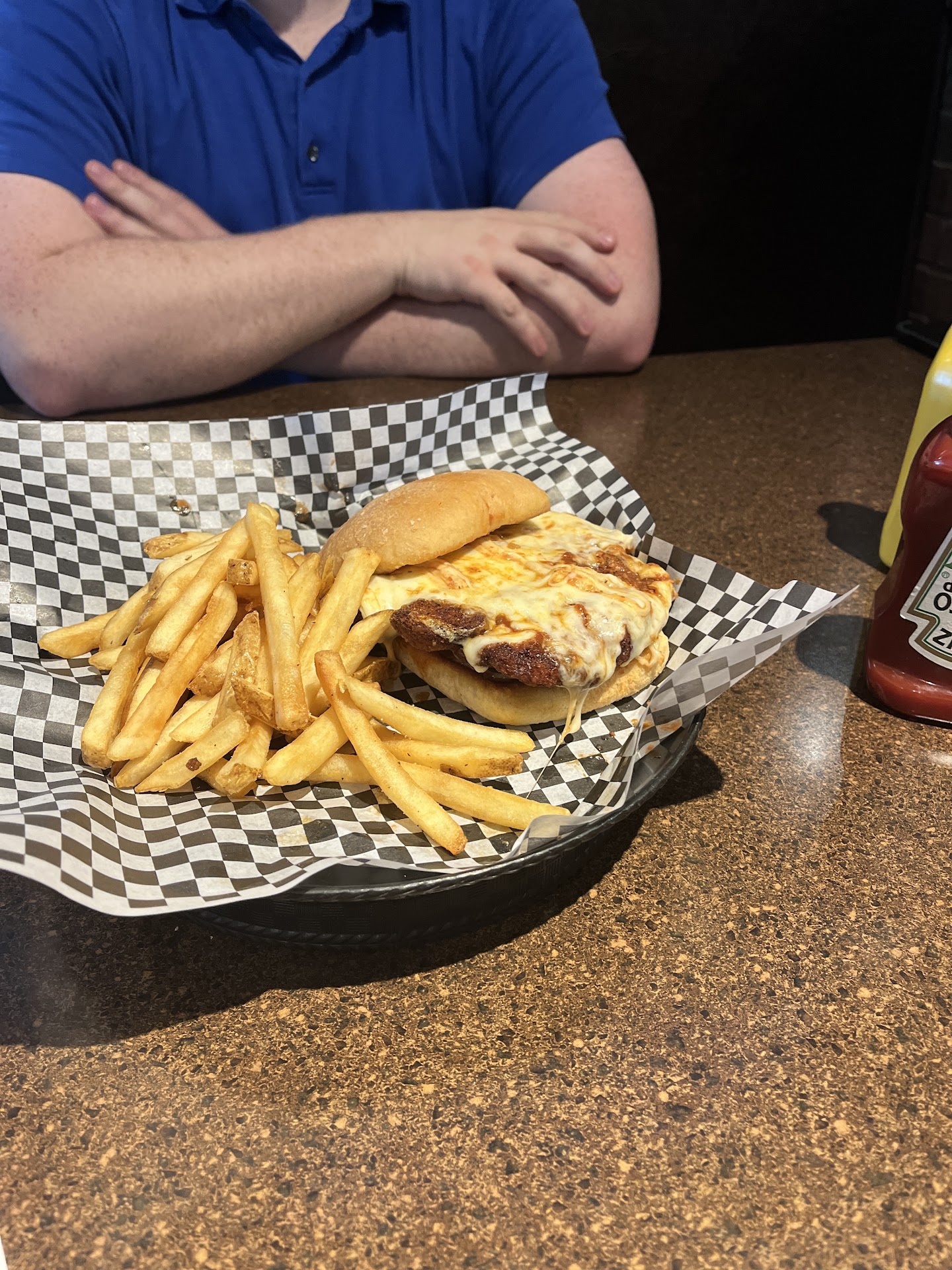 Read moreCame in around 2p and the place had 1 other table. We're greeted with "sit wherever you like". We wanted to watch the little League world series so we sat in the bar area. Only 1 server on which is expected once the lunch rush is over. Drinks came quickly but the server went back to rolling silverware which from being in the business myself when I was younger I knew that. Unfortunately, she was talking/or listening to music on her cell phone with ear buds and came back 10 minutes later to get a food order. Once we ordered it didn't take long for the "bar food" quality to come out from the kitchen. My wife's fish sandwich was lukewarm at best and my chicken parmesan sandwich looked like the marinara was in the crust. That too was lukewarm at best and the bread was rock hard. The fries were better than the sandwiches but you only get a small handful of you're lucky. Was only given one drink refill and the server "handed us" off to the bartender who was more worried about talking to the kitchen staff and doing ordering and getting ready for the night shift. He came once to check on us and before I could ask for a refill he left to answer his/restaurant phone and then the...