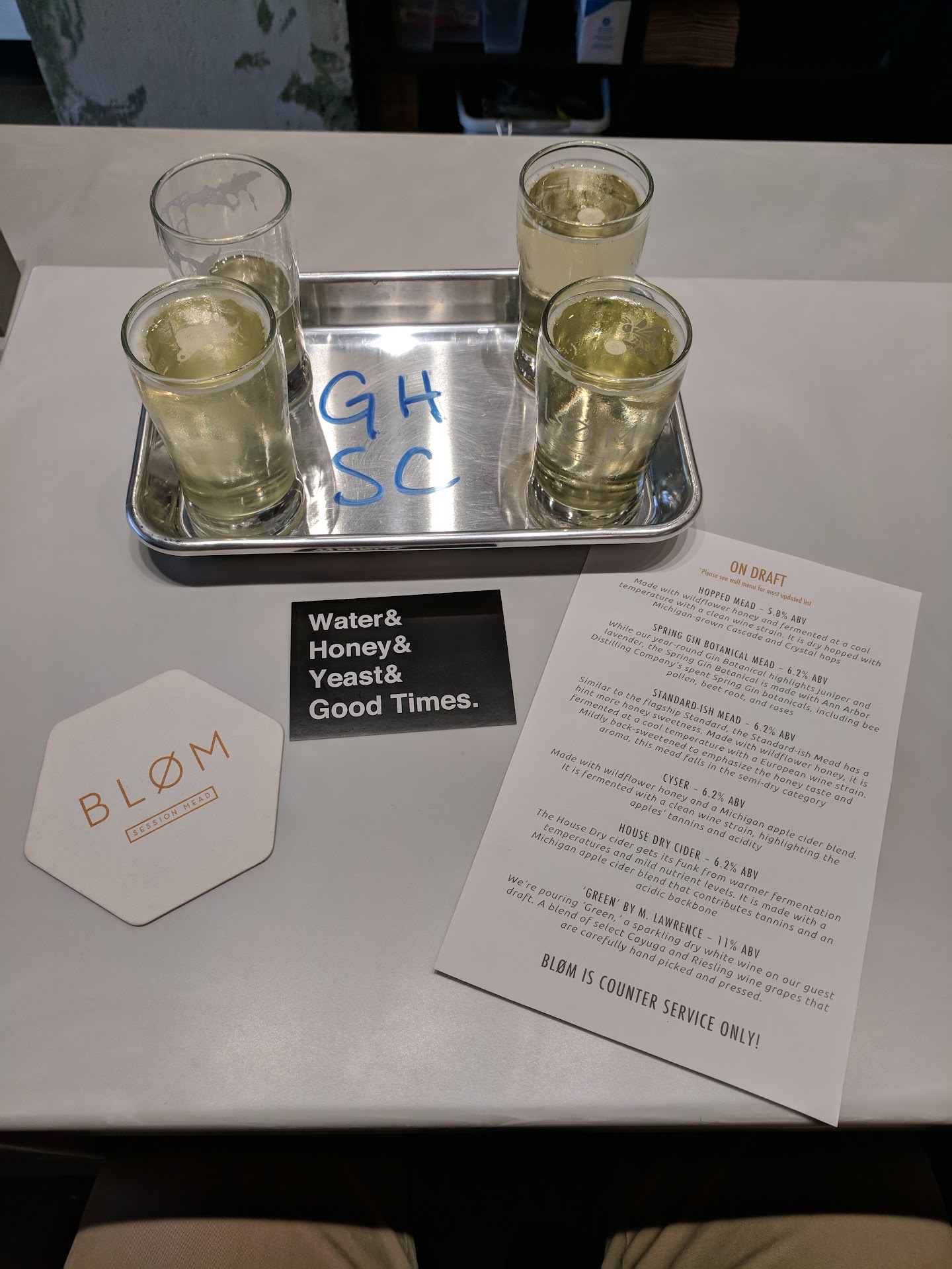 Read moreAbout a week ago I visited blom for the first time. I like mead and heard lots of great things about the drinks offered, and take no pleasure in leaving a negative review. The mead was great, and thbgge staff was very friendly. I ordered a flight which was very reasonably priced, and all 4 of the meads tasted great, were larger than expected, and came on a cute tray. My issue is only with the venue. The place was lit with very bright fluorescent lights despite there being a movie projected on the back wall. The seating was unnecessarily uncomfortable and awkward and the place echoed so much that just a few people speaking at a normal volume sounded like a crowded bar. Even thought i liked the mead and the staff, as long as the venue remains an assault on the senses I will have to skip...