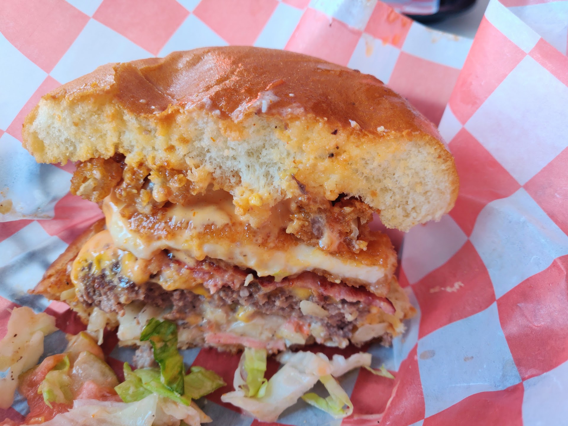 We ordered the recommended #1 Burger One Burger, as well as a side of Cajun fries⊠which came with slaw, a special sauce, and⊠cheese curds??? And onion rings??? We couldnât quite tell đŹ(slightly concerning)âŠ. I had high expectations, but the slaw was watery/under seasoned. The sauce was DELICIOUS, but I truly wished there was more because it was difficult to taste, and it was the star of the burger. The bun seemed to be old and was dry- and again, I may not have noticed if I was DYING of hunger. But genuinely, the patty was dry, and the bun was too.
