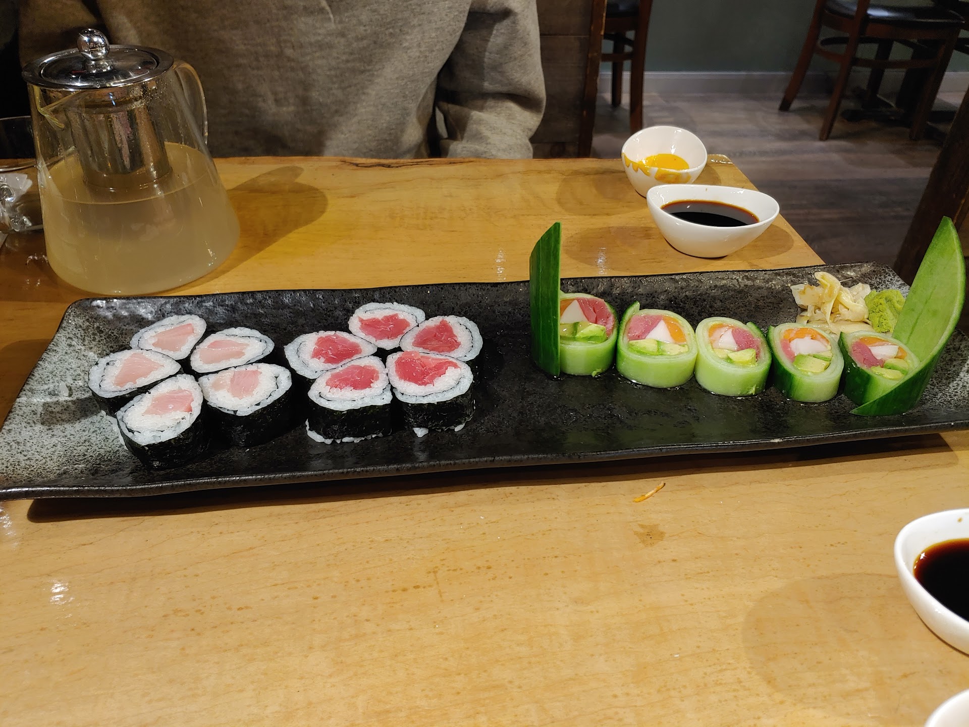 We ordered the pork gyoza and a bubble tea, along with some sushi rolls and a stir-fry dish. The gyoza was very good, some of the best I’ve ever had. The bubble tea was not bad, either. I didn’t try the stir fry but my boyfriend said it was good. The sushi, however, was a disappointment. We shared a snow crab roll and it was the worst sushi I have ever had. The crab did not taste fresh, the roll was warm, and it had zero flavor. I ordered spicy mayo with the roll just in case the flavor was lacking, and never received it from the server even after asking for it twice. The other sushi rolls were just OK.