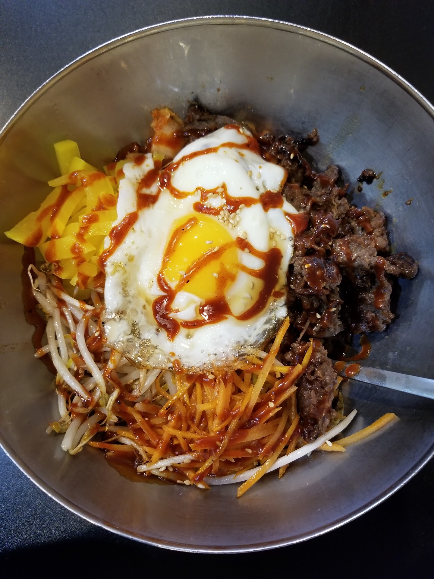 The food came out quickly in simple metal bowls and look great. The egg on top was perfect. Good crunchy bottom and runny yolk to mix in. I got the beef with mushrooms, bean sprouts, kimchi, and pickled daikon and I was very happy with that combo. It came with a couple of sauce options. I opted for the slightly sweet and spicy sauce, which perfectly complemented the dish.