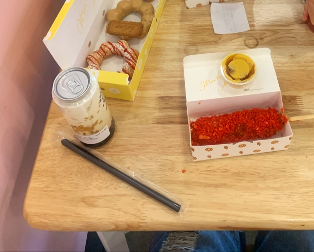 I ended up ordering 3 donuts, a cheese and potato corn dog, and a Boba milk tea.