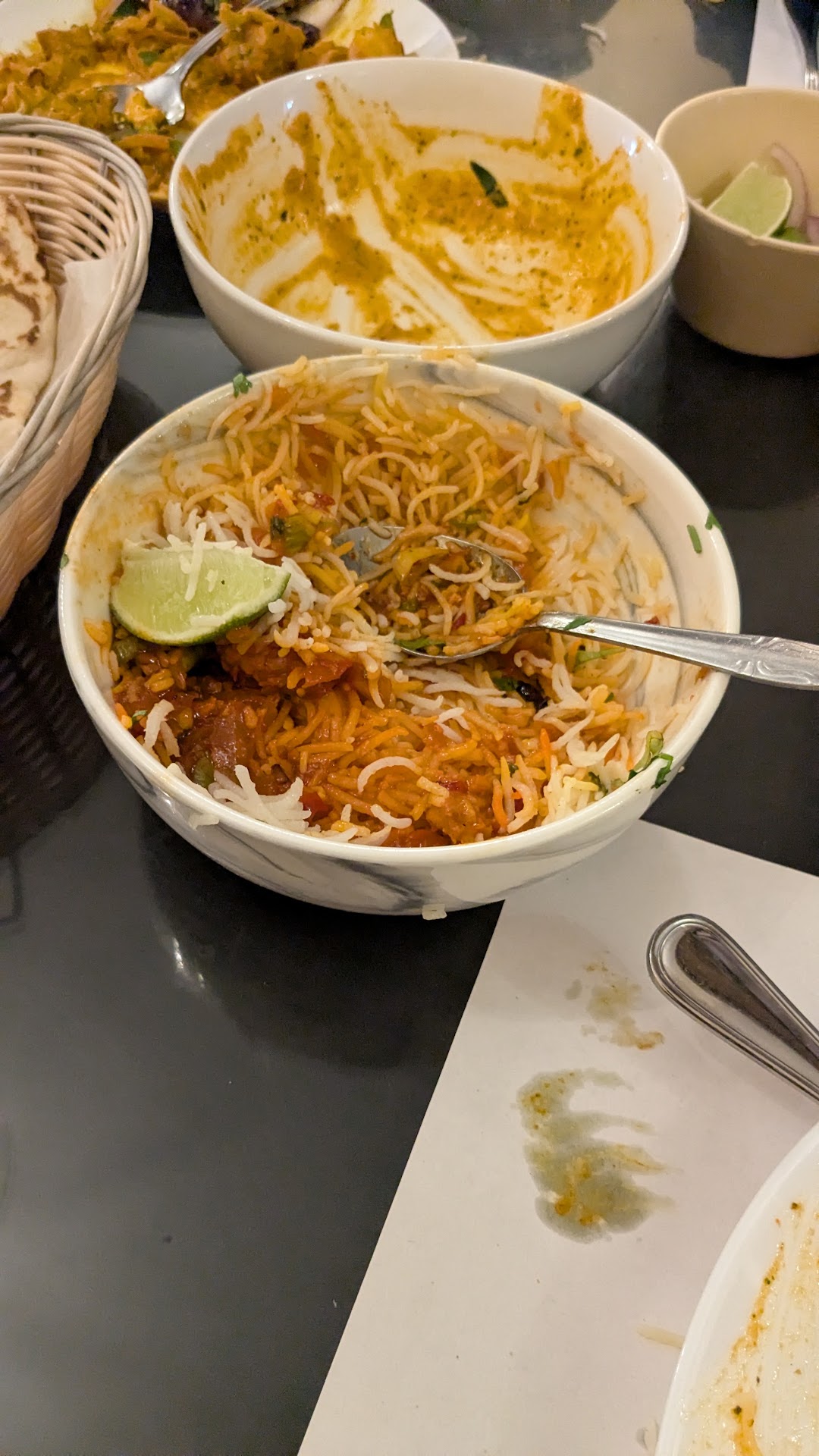 Service: The service was slow, despite the restaurant not being busy. To make matters worse, we ordered paneer tikka masala (as vegetarians), and they served us chicken tikka masala instead. When we pointed this out, there was no apology, no remorse, and no effort to rectify the situation. Adding to the frustration, the staff seemed disorganized and indifferent. Even the surrounding tables weren’t cleared, with dirty dishes piling up around us.