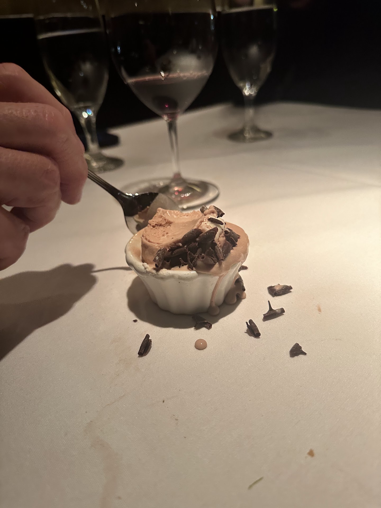 We finished with the crÚme brûlée, and the staff was thoughtful enough to write an unprompted birthday message to my mom on the plate (props to the pastry chef and their prep team/platters who have some very impressive chocolate sauce calligraphy skills); they also included a cute miniature cupcake with a candle in it. I wish I had thought to grab a picture of it before we dug in!