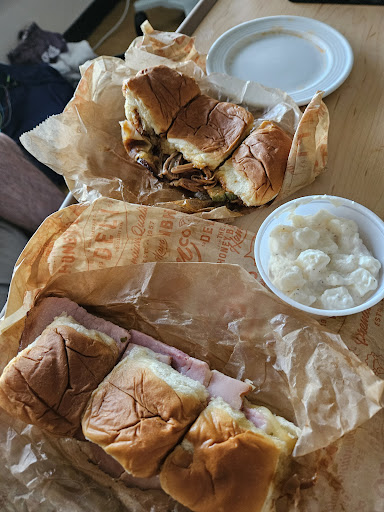 Read moreFirst time ordering. We ordered 3 ham and cheese sliders, 3 Cuban pork sliders, and a single side of potato salad. The sliders were delicious but very small, even for being on King's Hawaiian Rolls. Three were the equivalent of a 6-7 inch sub with about 6 ounces of meat and cheese. For comparison, the plate in the image is roughly 5" diameter. Plus, they were smashed when we got them. The potato salad was nothing short of 3 ounces of totally flavorless...