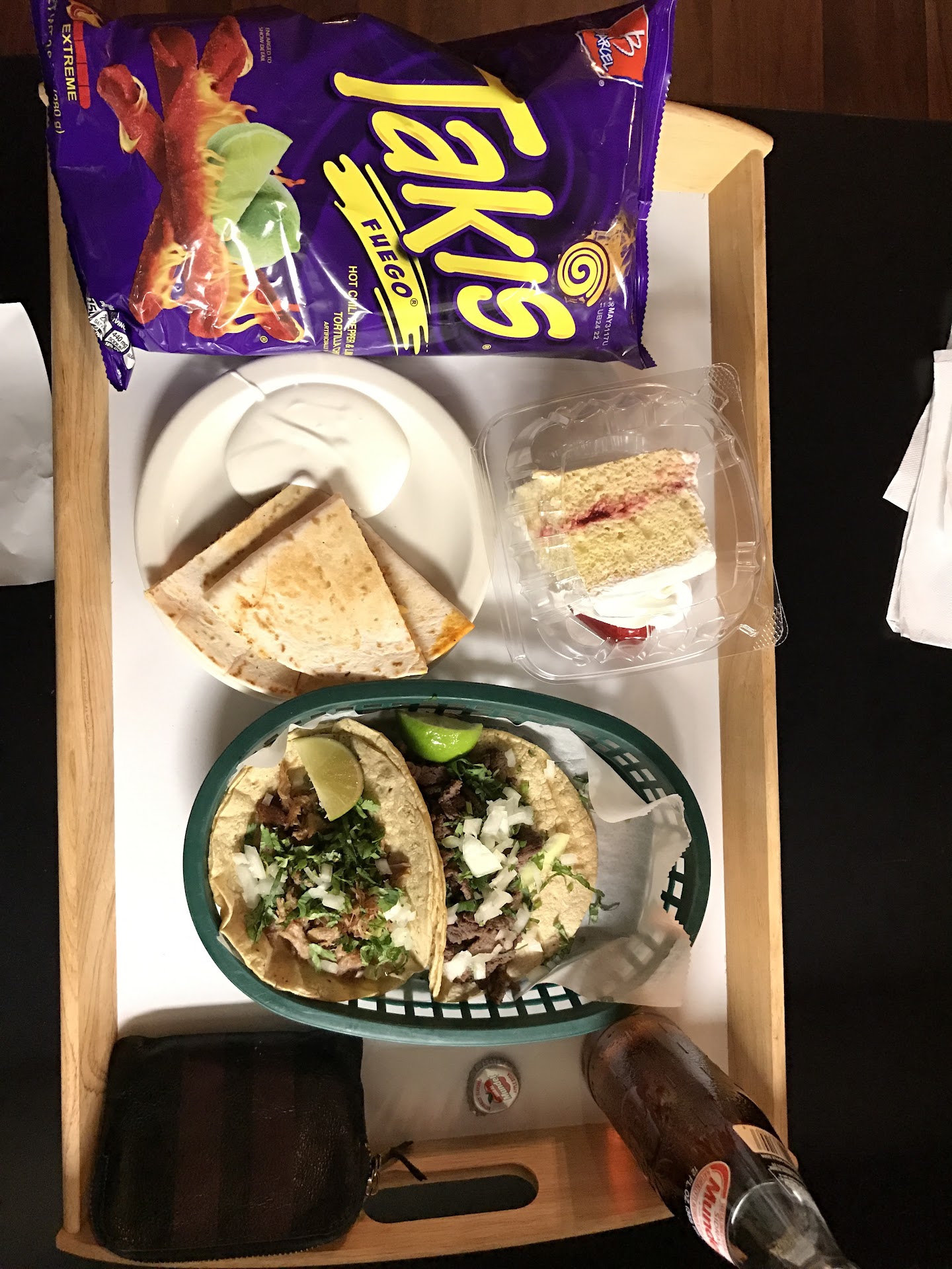 All items are a la cart, because the owners are savvy af. I got the quesadilla with chorizo, two tacos de carne asada y fried pork. They come with standard embellishments (cilantro, lime, onion, and hot sauce) and any added fixings are $0.25 a pop. All their prepared sides looked amazing, but I substituted for a bag of the worlds most loved and then regretted chips: Takis Fuego.