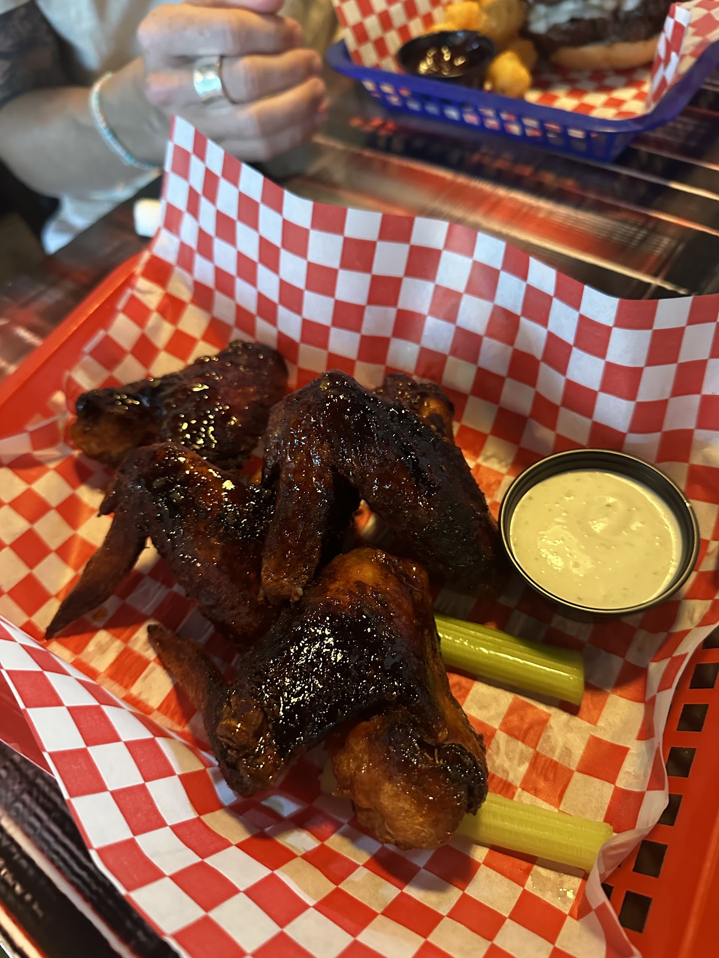 The food way ok. I had wings and the sauce (Thai chili) was good but they were a bit overcooked and dry. My daughterâs burger was a bit burnt on the outside of the patty. My mother in laws lobster mac and cheese was really good according to her.