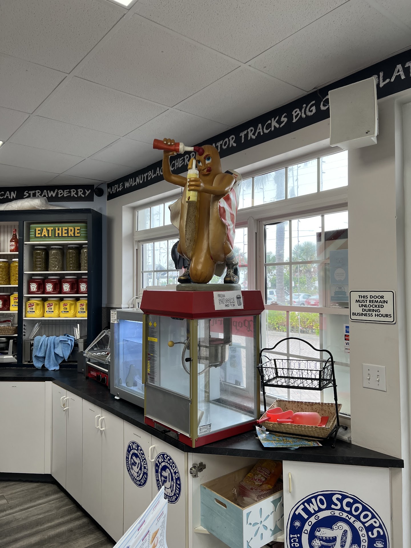 The atmosphere works for the locale and the food is really good as well. I particularly like the breakfast offerings. I'm not much of a desert guy, however, whenever we go to Two Scoops I make sure to get at least a couple scoops of Ice Cream. We normally go in a large group (all the kids and whomever is going to the beach with us) and our group is pretty much always accommodated (seating-wise). There are plenty of seats, and when there isn't, some of us sit outside.