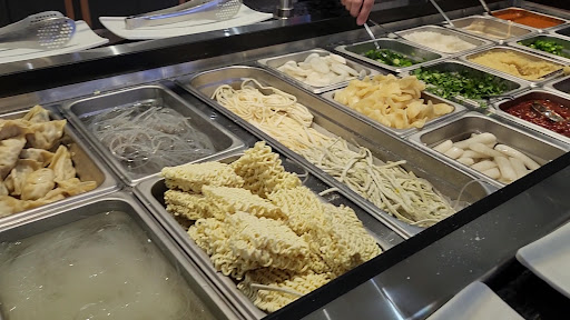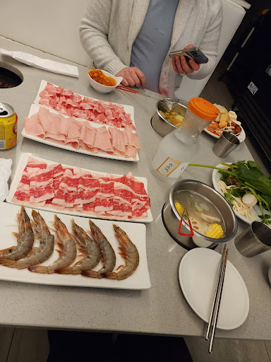 I dined out here on a Friday night with my vegetarian friend, and to our surprise it wasn’t busy. The price is the same regardless of if you get meat or not, but the selection of veggies at the buffet makes up for this. The meat is all you can eat and the server was attentive and quick to bring me more when I asked. We both got the spicy veggie broth, and it was lacking in flavor. Luckily they have an amazing sauce bar so we could season it to our liking. I highly recommend using the sesame paste when making your own sauce. Some of my favorite buffet items were the bok choy, watercress, chopped mushroom stems, crab meat (they’re wrapped in plastic, so make sure you take them off), Korean sweet potato, pumpkin, and tteokbokki.