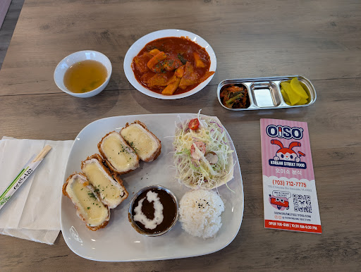 I was intrigued from the start by the cheerful character on the OiSO sign that lends a pop of color to the unassuming corner shop location of this restaurant. I was pleasantly surprised at how bright and airy the interior felt, with a simplistic modern flare. Everything was well lit and easy to navigate, from the menu board to the array of drinks in the wall cooler. The young woman at the cashier was pleasant and helpful, while one of the chefs (head chef??) stepped out to greet me and then checked on how I was enjoying my food later as well. My only caveat about the interior is that you had better love K-Pop and be ready to sacrifice having much conversation because it's a little too much to talk over, for me anyway. (I do love K-Pop but wouldn't have minded it a tad lower). The big screen with the music videos was a fun touch as well. I arrived around 2PM on a Wednesday and my food came out fast and was very fresh. I heard them pounding the pork for the mozzarella donkatsu in the back when I arrived. I really enjoyed the finely sliced/shredded coleslaw which was an enjoyable side to the donkatsu. As noted in another review, the mozzarella was plentiful and yet did not overwhelm the pork. It was the perfect balance of crunchy and gooey. The sauce which seemed to be BBQ based, was light in flavor and perfect for dipping. The tteok bokki was just right, not too hot not too sweet. The fishcakes were not too fishy either. I enjoyed the little side dish of house made kimchi and some pickled radish slices as I ate through my meal. I was a little confused by the small bowl of very weak room temperature broth brought with the tteok bokki. I should have asked if it was supposed to be heated up, (which would have made it a little better to cleanse my palatte with IMO.) Overall, very happy with the quality of everything from start to finish and cannot gripe too hard on the broth, but a better version of that element would have made it perfect. Will be back again with...