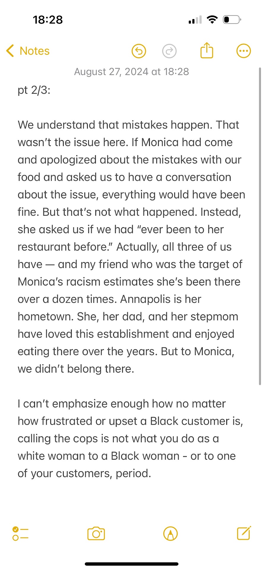 Monica started making comments to my friend about how she âneeded to stop making such a big deal of it,â that it was âjust foodâ and that she was âscaring peopleâ by being so âaggressiveâ at her âfamily restaurant.â This is when the incident began to turn racial. My friend is a Black lesbian, and it goes without saying that Monica would not have been using that language with someone who was not Black. My friend came back outside and sat down at our table to wait for our food. While we were waiting, we were discussing what had happened and were (once again, rightfully) growing increasingly upset at how we were being treated. Monica accused us of lying about ordering a vegan omelet and said the other customers in the restaurant didnât hear us ordering a vegan meal and said we ordered a âveggie omelet,â which of course, didnât happen. Since when do restaurant owners survey their other customers about conversations that happened between the staff and a customer? When Monica heard us discussing how upset we were, she took away all of our food, packed it up in a to-go bag, and told my friend to leave, otherwise she was going to call the cops.
