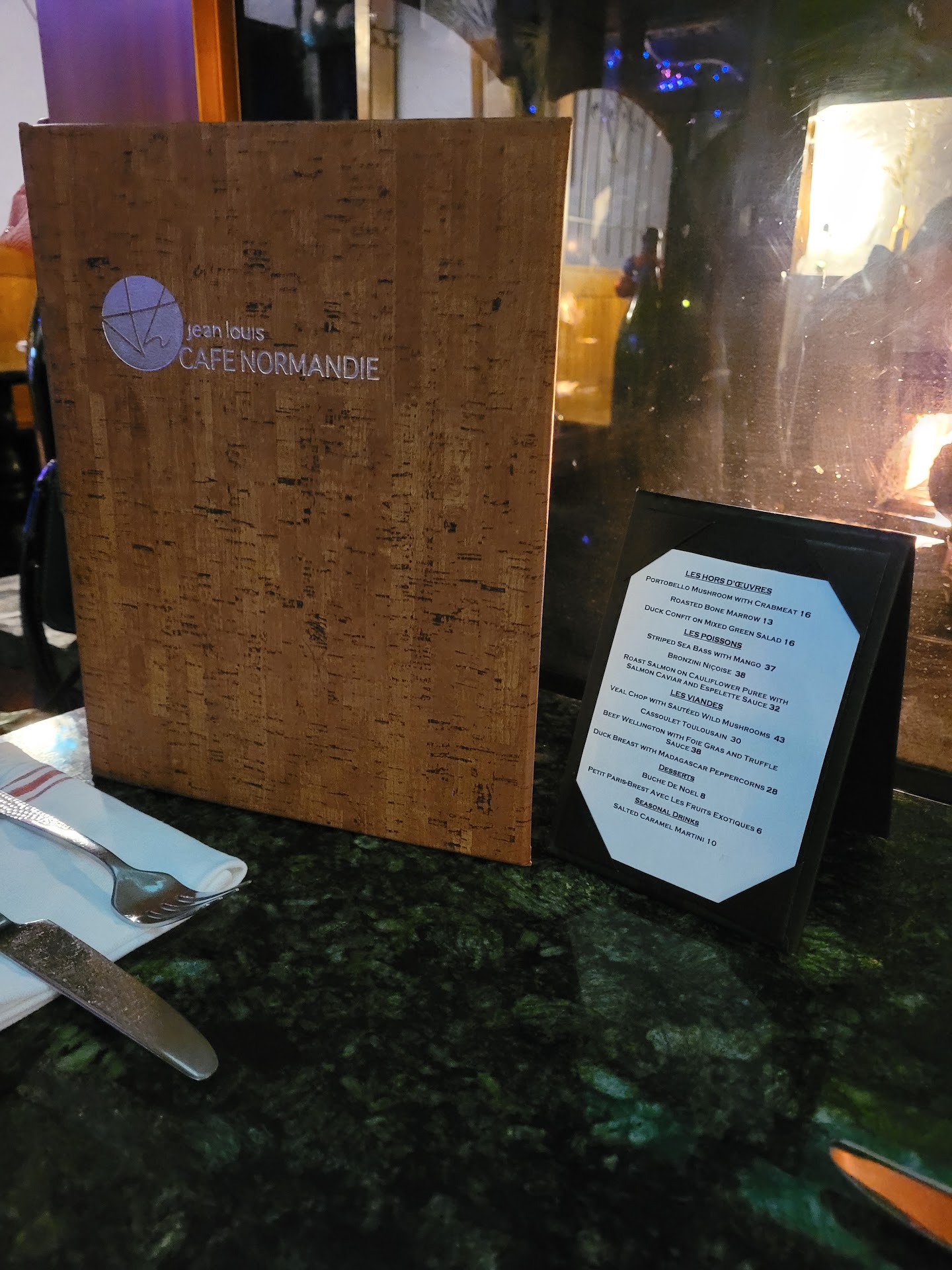 It looks like someone from the restaurant reads the reviews here (just not on help). This gives me hope! My beautiful wife and I showed up ten minutes late for an 8PM Saturday night reservation with the in-laws and were seated after about a 15 minute wait. At a busy restaurant (which it was) this is within the realm of the acceptable. We scored the cozy big table facing the central fireplace! Below there's a pretty big list of "The Bad" but I wanted to lead with the good first because overall our experience was great--we walked out looking forward to returning. The GOOD: Hostess noted my birthday multiple times--good attention to detail. The duck mousse and country pate was superb. Award-winning chef Jean-Louis was working the kitchen and I went back to ask him where he got his mousse from and he informed me with a chuckle that he makes everything here! If you've never eaten duck mousse, you must try it--it's the richest most delicious flavor...to die for. My bride and her mother both got a veal dish which they raved about--particularly the spot-on sauces. My father-in-law got the roasted chicken with perfectly crisp skin and juicy meat--all with a perfect rosemary au jus--delicious for dipping in your french fries. Timely check presentation and payment processing. I hate it when you get great service a whole meal and then it takes forever to get your check. Our waiter didn't have this problem--he nailed this portion as we prepared to leave. The BAD: The following was not acceptable for a restaurant at Cafe Normandie's price point and reputation: No guest should be an island. sat at least 5 minutes (probably closer to 10) without being greeted by our waiter or offered water by anyone. Attention to detail. We had to ask each time for a refill of our water. This is a pet peeve of mine. The first time, 3 of 4 glasses sat empty more than ten minutes. Refilling guests water without them asking is indicative of a not only attentiveness by the waitstaff but also shows teamwork by the bussers which in turn indicates leadership (or lack thereof) at the managerial level. I get the sense that there's not a front of house manager here--there's the formidable Jean-Louis running the show in the kitchen and a young harried woman sitting tables up front. Houdini of a waitstaff. I noticed that we weren't the only table searching at times for our waiter/waitress. I counted 4 total waitstaff in the whole place--they could probably have used one more OR train them to hustle a little more or even a moderate amount? The land of outlawed smiles or Paris of the West? Our waiter never smiled once and didn't seem particularly happy to be there. Of the three working, only one seemed happy to be working there. One busser smiled and the hostess did as well but that was it. Maybe they were seeking to emulate the Champs Elysee resto experience? To bicker or not to bicker, ca c'est la question. The hostess stand was located behind our table and the group of waitstaff there spent a good minutes arguing about how various workers should get tipped out. Evidently one busser? left early and didn't do any of his/her side jobs but said person was still going to get tipped out the same as everyone else. According to one of the staff, they'd been saying since the beginning, the bussers should be getting paid hourly to make it more fair...and on and on. Look, I worked as a waiter all through high school and college--these are valid points but not topics to discuss at a volume where your guests can hear you.