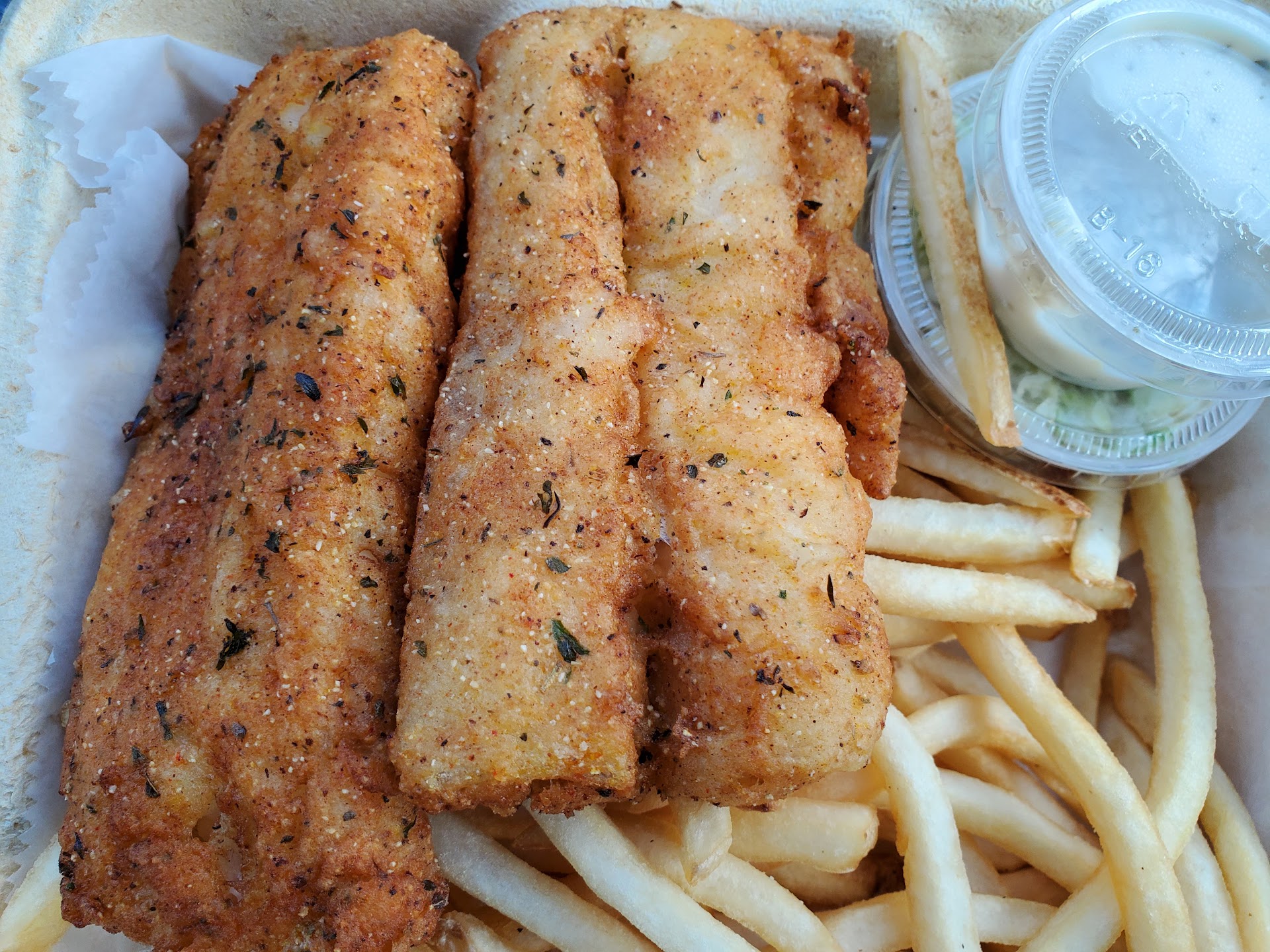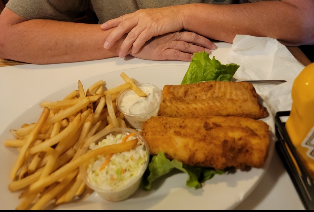 Food: a good variety. Gumbo, crab balls, fish & chips, fried pickles, onion rings, salads, crab cakes, sandwiches, etc. We did see another table order the crab balls and they looked small. Our fish and chips came with fries, coleslaw, tartar sauce and it was all good.