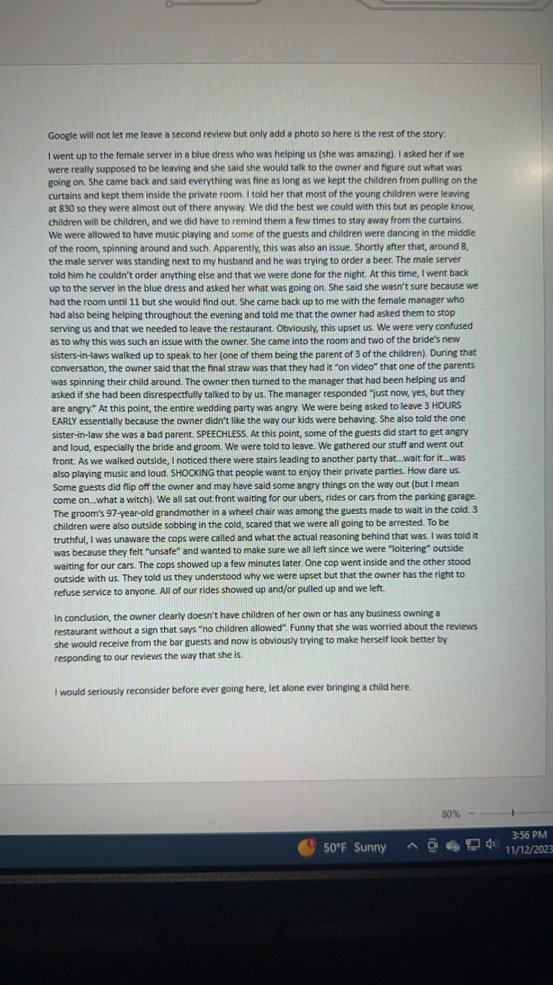 THE EVENTS: We booked a wedding reception there in a private room with 40 guests, 12 of them being children. I was the photographer, so I was paying attention to everything the whole night since I was snapping photos of everything going on. We arrived at 5 pm and were taken back to a private room next to the bar. We were given two servers (one male and one female) and a female manager who came in and out to help as needed. They were all very polite and helpful until the male server got upset when a child got in his way. Around 730, I noticed the bride standing outside of the curtains talking to who I assumed was a manager, but it was the owner. She had pulled the bride aside and told her that our kids were screaming and being too loud and disrupting her bar guests. She stated that all of the bar guests had left because of the children. When I looked at the bar, there were roughly 10 chairs and maybe 4 of them were empty. The bride then asked her if those 4 people and their money were more important than her, her guests and our money. The owner responded no but continued to say she was "worried about the reviews" they would leave about it. She told the bride that we had 15 minutes to get the children under control or they would have to leave. This made the bride RIGHTFULLY upset. The owner said had she known we would have this many children, she would have put us in another room. To which the bride responded that she was told in their email conversations that the party would include 12 children. I asked the bride to walk away so I could finish the conversation as to not further upset the bride on her wedding day. I asked the owner what the actual issue was and if the guests specifically told her they were leaving because of us. She said yes. I later found this to be untrue after speaking with a guest at the bar who said we were not disrupting them in any way. The mother of the bride came over and also got upset (I mean who wouldn't when the owner is telling you to basically make your children shut up or get out). I told the owner I assume this restaurant just isn’t a place for children and they would all be leaving by 830 anyway. We ended the conversation and I walked back into the private room.