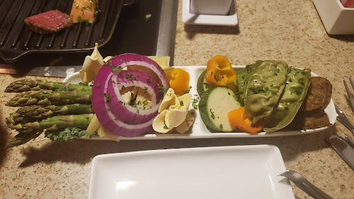 The primary reason for the low stars is the price of the food, quantity, and sanitation. Our first course was cheddar which cost almost $40 for the 4 of us for a bowl of cheese, some bread, and a few veggies. (Sorry, no pic!) The next course was salad which were $6.50 each, so $26 in salads for 4 - and it was a small plate. (Also no pic - sorry!) The entree was minimal and left a lot to be desired! (See the pictures of the Vegetarian option and Land and Sea.) Perhaps you're paying for the various meat choices, but averaging $22 - $28 per entree left us with a hefty price tag for the entree alone. On top of the entree you order, they brought a bowl of asparagus, zucchini, and mushrooms for the table to also eat. If I had known that, I probably would have not gotten the veggie dish at $22(?) because that's basically what I received anyways besides 2 small mushroom pasta purses (taste was good - not great), maybe 2 or 3 veggie 'meatballs' (taste was NOT good), and 2 veggie dumplings (also not good). After the entree, our waiter said he would come back to wipe down the table again...remember it had raw meat juice touch it...he took so long that he forgot to wipe it down and he immediately plated our dessert boards before we could say anything. Again, didn't make a big deal out of it...just didn't touch the table after that. Dessert was the best part - a few pieces of waffle that my kids said were the best part of dessert, a few marshmallows, a few pieces of rice crispy treats, and a few pieces of fruit - to dip in your choice of dip, which we choose original which was chocolate and peanut butter.