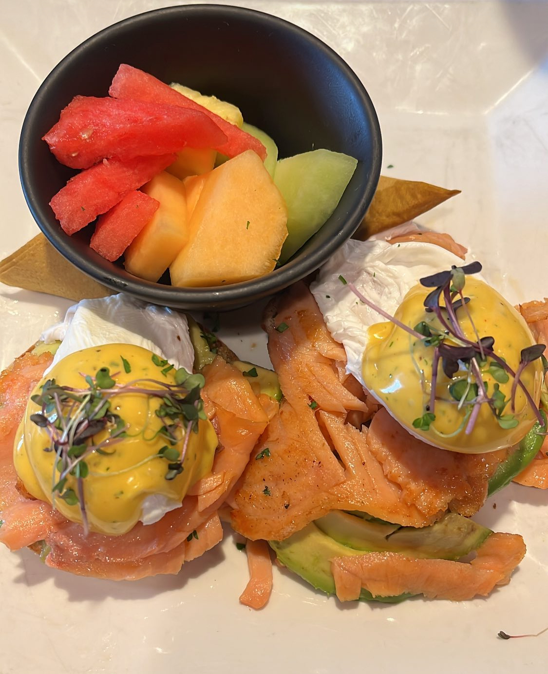 Food seemed very delayed for the restaurant being so empty. Only a hand full of tables were occupied and a few at the bar. 15 customers total, maybe. I got the breakfast burger, it was good. No complaints really. My partner got the Benedict and a beet salad. The salad was pretty good. The Canadian bacon on the benedict was super dry and tough. The hollandaise sauce didn't taste like hollandaise at all. Very salty and super thick, unlike other hollandaise we've had.