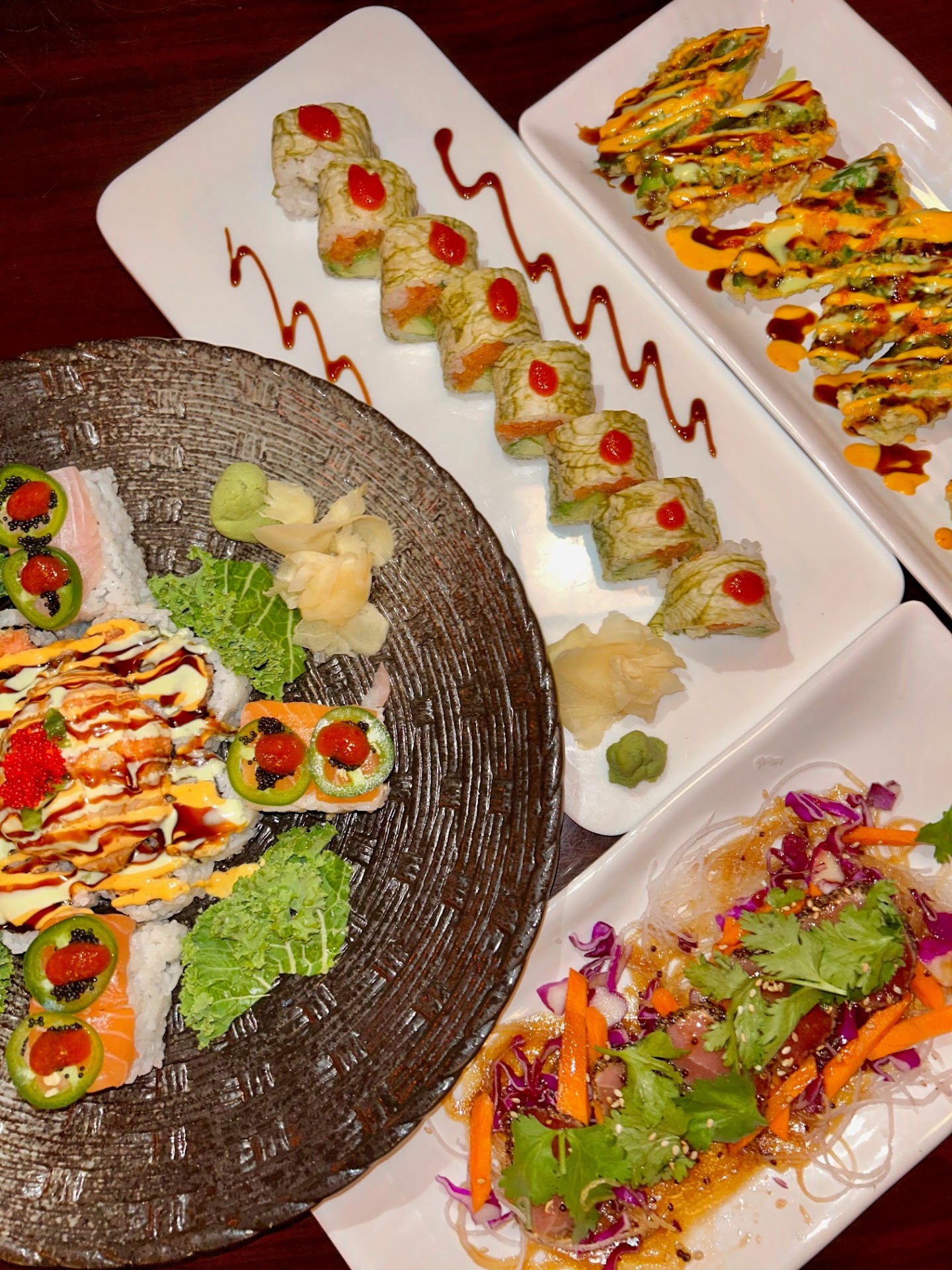 Read moreTraveling in, this was the perfect sushi restaurant stop. We went to dinner Sunday evening around 7pm and it was not crowded. We were greeted immediately by the staff and served with our drinks, appetizers, and food quickly. The staff were kind, attentive, and efficient. For appetizers, we got the Pepper Tuna Adventure (the one with radish and cilantro) and Sexy Jalapeno (has spicy mayo and eel sauce drizzled on top).The appetizers were absolutely mouth watering, flavorful, and dynamic. For the entrees, we got the Tiger Eyes Roll (the roll with one dot of spicy sauce on each sushi piece - hint the tiger eyes), Super Volcano Roll (roll in the middle of the circular plate), and another roll with jalapeno on top (I forgot the name). The rolls were made to perfection by the Itamae's (sushi chefs) and were very filling. The customer service was phenomenal from the waitresses, front desk, Itamae's, and manager. I would definitely recommend coming here for excellent sushi and fairly priced options. I will be coming...