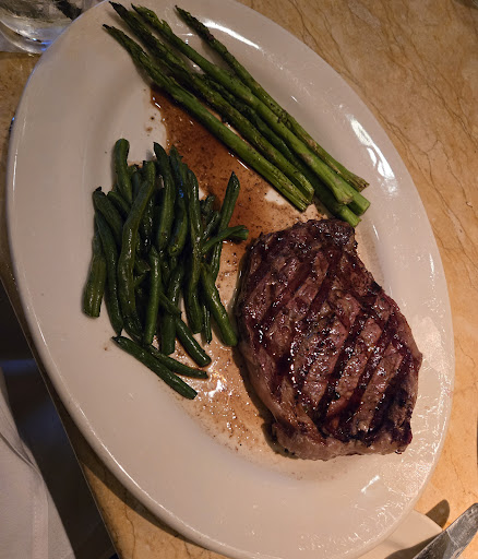 Our meal began with the customary bread and butter. Naturally, my son and I gravitated toward the ribeye steak, accompanied by asparagus and broccoli. The domestic engineer of mine ordered the crab dip and an Aperol Spritz for her, and the Chinese Chicken Salad was for a shared salad. The receptionists and servers were bustling about in the spacious dining area, which, despite its huge floor size, was packed with tables, necessitating careful navigation through the narrow aisles. Despite the full house, the food arrived in a timely manner. My steak was perfect medium with grill mark and balancedly seasoned. The cut was a bit thinner than that of other steakhouse, but safe ans easy cooking might be beneficial for busy family restaurants.