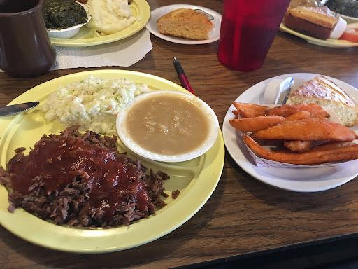 Looking for some BBQ in my travels, I ran across this place and decided to give it a whirl. The service was prompt and courteous and my server Tandi was great. The tea was soured, either the sweet or the unsweet tea, as I prefer half & half. I ordered the sliced beef brisket come slaw and baked beans. The beans were good and even had a little meat in them, very sweet they were. The cole slaw was more or a finer puree style of chop with very little carrots in it, a very runny mayo style. The beef had a lot of gristle in it and had hardly any smoke flavor at all, it came smothered in bbq sauce, had it not it would have had no flavor hardly. Look at the picture, the smoke penetration was about 1/8" into the meat, very little. This meat was dry as well like it had been sitting around under a heat lamp for sometime, maybe it was just overcooked, but one or the other. The cornbread was dense and did not rise very much when it was made. It also had been made for a while. The portions were decent, this was the best thing and the price was not bad, had everything been better. If out looking for bbq, pass this...
