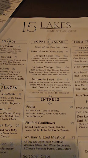 Maybe we went on an off night? My husband and I visited 15 Lakes for the first time last weekend. We were excited to try it, given the great reviews it had so far, plus we are always excited when a new restaurant opens in the area, as we enjoy eating out and like to support local businesses. We really wanted to love this place!!! Unfortunately, our experience at 15 Lakes wasn't that great, and it definitely was not worth the price point. The restaurant is small but has a good location on Main St. They have furnished it with mostly high-top tables, and just a few regular height tables. Overall, the furnishings and decor felt sparce and utilitarian. When I think of a steakhouse, I think of plush booths with candles and a romantic, cozy vibe that this restaurant does not have. That said, the minimalist decor is more modern and may appeal to a younger crowd. We had an earlier reservation and were only 1 of 2 tables seated in the whole place. We were sat at a very small table near the door. (I thought it odd we hadn't been sat at a better table and instead at what seemed like the worst one when the place was empty?) The host was also functioning as the bartender, and he made our cocktails poorly. I ordered my favorite cocktail (cosmo) and it was very disappointing, especially for $16, and was served dripping without a napkin. My husband ordered a Jack Daniels and ginger ale, and we watched the host make it with just sprite. Usually, a restaurant will tell him if they don't have ginger ale and then he will then order a Jack and coke, but the bartender (host) just made it with sprite and didn't say anything. Our waitress never informed us of the specials or the soup of the day, even though I heard a different waitress tell her table. My husband had the oysters for an appetizer, and he said they were excellent. For our meal, my husband ordered the petite filet (4 oz, $26) medium rare, and I ordered the halibut ($37). Both of our meals were very overcooked. My husband's steak was cooked medium-well with hardly a small touch of pink left in the very center. My halibut was completely dried out. I will say the mashed potatoes and green beans were excellent and the best part of the meal. Here's the thing - a restaurant that calls themselves a "steakhouse" should be cooking the steaks perfectly. Also, for the amount of money they are charging, the food should be really, really good and perfectly cooked. Maybe it was just an off night. We'll give them a year to work out the kinks and if they're still there maybe we'll give it...