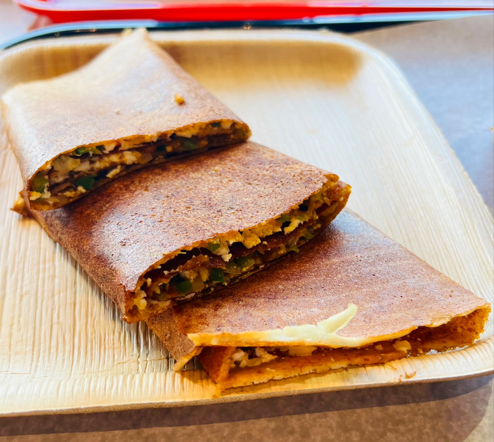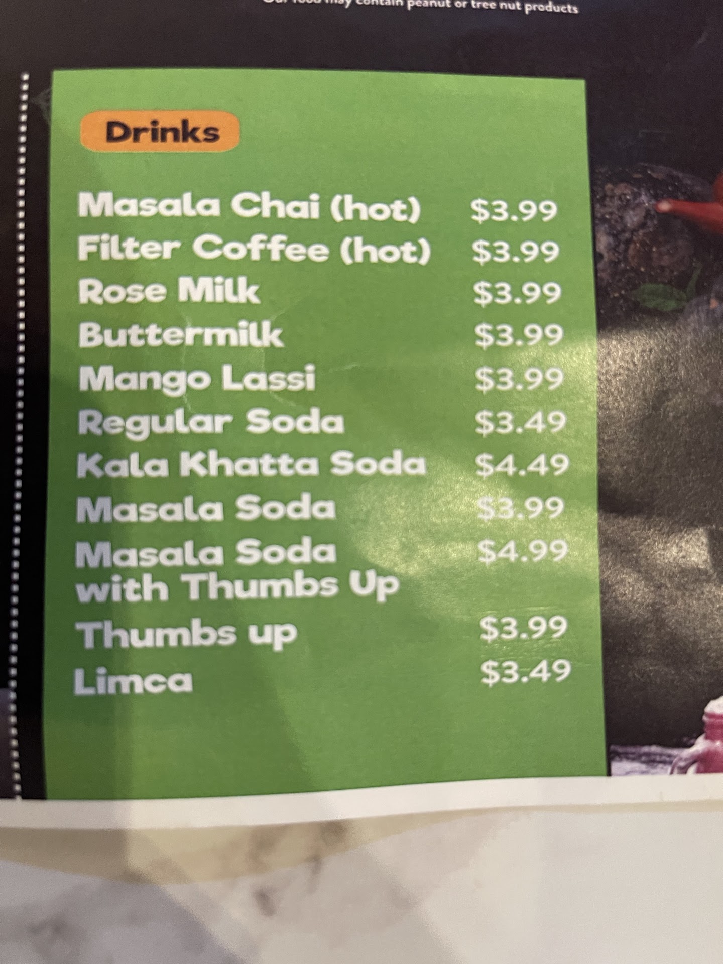 I ordered the masala dosa with a rose milk to drink, and it was ready in under 5 minutes. It comes with 3 chutneys (coconut, peanut, and tomato) plus a cup of sambhar (which is like a medium-spicy vegetable soup you can eat with a spoon.) Everything tasted incredible. The dosa was crispy without being oily, with a delicious mildly-spiced potato filling. The chutneys and sambhar were each great too. And the rose milk tastes just like smelling a beautiful rose, with crunchy little seeds in it (I think they’re basil seeds?) I loved everything.