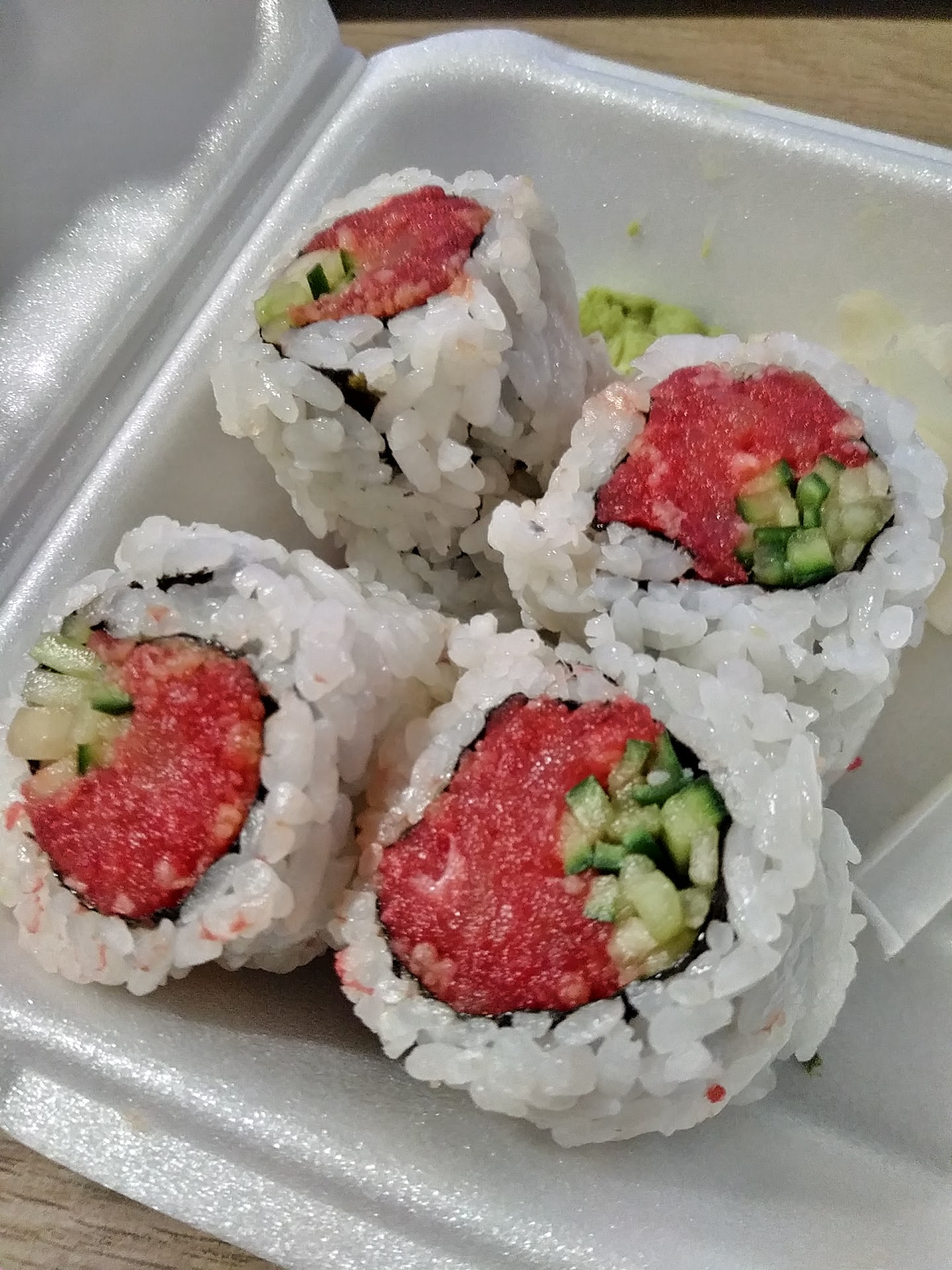 Food: Unfortunately, this is just terrible. Teriyaki beef is very difficult to chew. I forced myself to finish it cuz I don't want to waste money. The veggies & sushi that comes along w/ teriyaki beef taste good btw. I was excited to try the other two sushi. When I tried the two sushi, it wasn't fresh & felt like chewing a bubble gum. I ate sushi plenty of time at Sacramento (Sushi Hook) & SF. They are so good. But this? It makes me sad that I wasted my money.