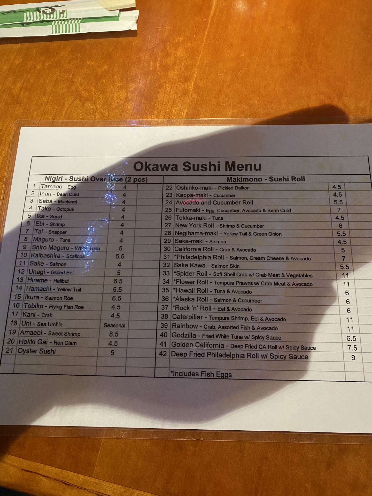The experience of Okawa is definitely enhanced by sitting at the sushi bar. Better service and attention by far. Let Teddy and Jeping (Jee-ping) talk you into trying something new! They have introduced us to many creative and tasty culinary experiences, many of which became our favorites: