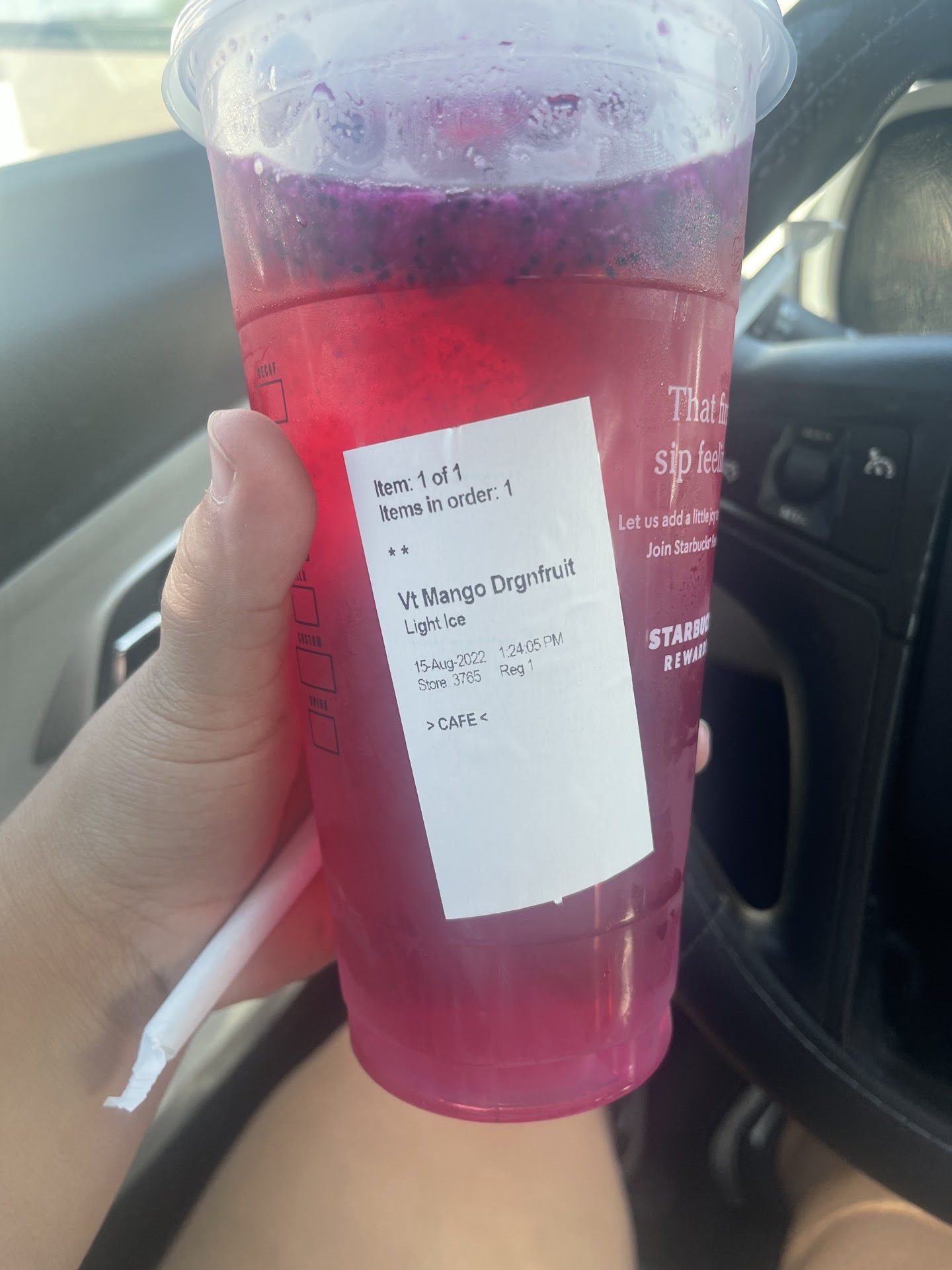 Starbucks please do better. Went in on August 15, 2022 at 1:44 pm as you can see on my receipt. Ordered a trenta mango dragon fruit refresher. As soon as I paid the barista told me my drink was ready, which was strange to me considering I had barely ordered it. I took my drink and got on my car and noticed the label on the drink was from a order time of 1:24 and the label information was not what I ordered. The drink had no ice it tasted watered down and the dragon fruit in the drink was all disolved. Will not go back to this Starbucks. If I pay for a drink I expect a fresh drink to be made not for you to give me something that was sitting on your counter...