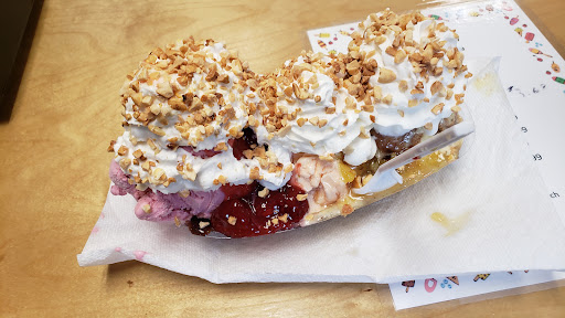 Best ice cream shop in the county. Blue Bell served generously. Today I got a banana split, the largest I'd ever seen. It must have weighed 2 pounds. The first banana split in my life i couldn't finish in one sitting. The rest is in my freezer to be finished tonight. Huge scoops of Banana Pudding, Peachy Peach, and Strawberry, with walnuts, peanuts, pineapple and strawberry toppings, whipped cream. Price, I don't remember - but my banana split and a single scoop for my wife and a single scoop for my son totaled $15. Extremely generous with...