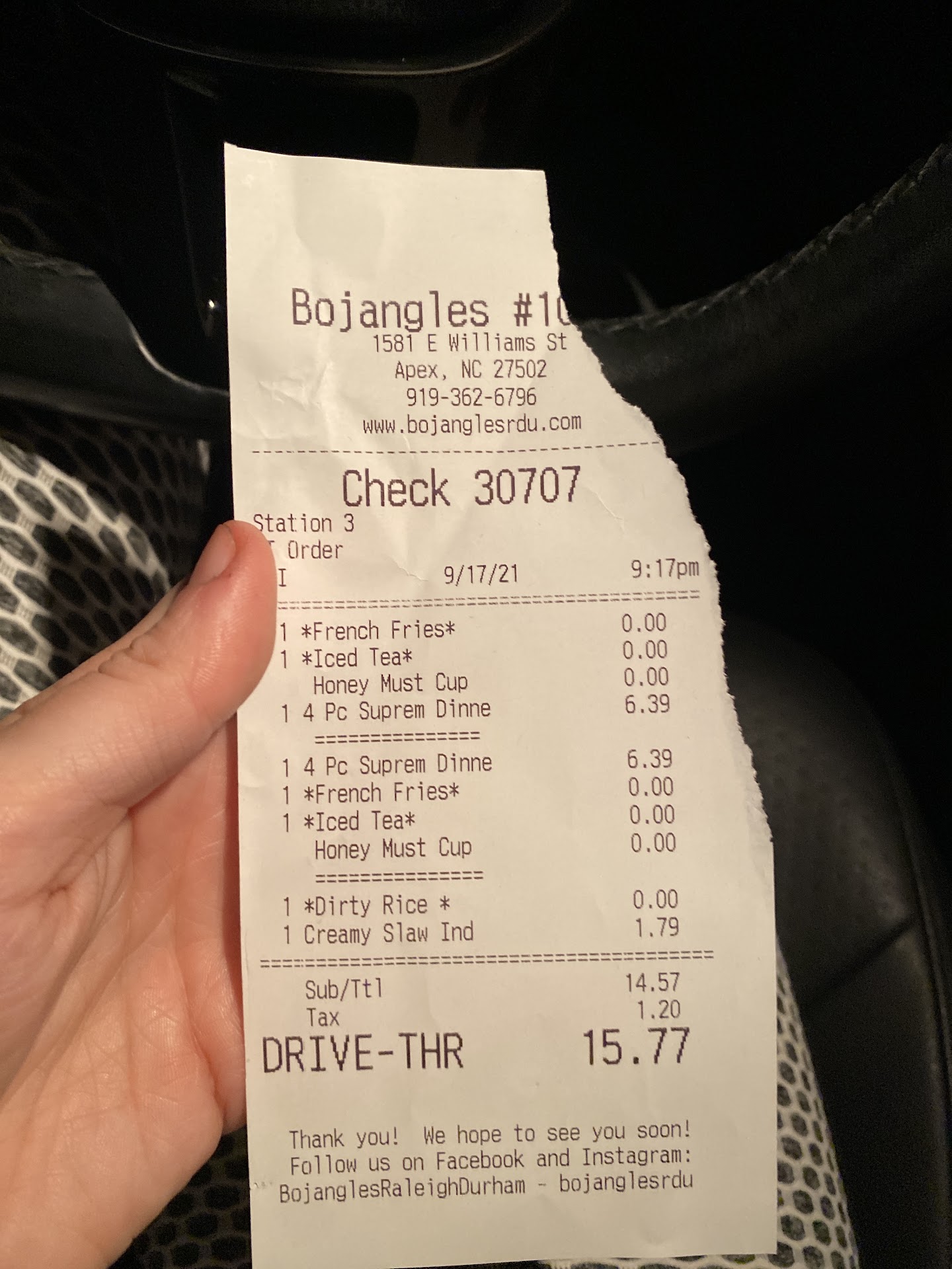 I love Bojangles, but NOT this location. I went to the drive thru at 930 PM and I was there for 20+ mins. It was like they were cooking everyoneās meal one item at a time. The poor guy 2 cars ahead of me was asked to take the infamous āpark over there and we will get you your food ASAPā spot. That poor bastard is probably still waiting. When I drove off he was cussing from his car window at the poor overwhelmed Drive Thru kid. This location is in dire need of quality managers...
