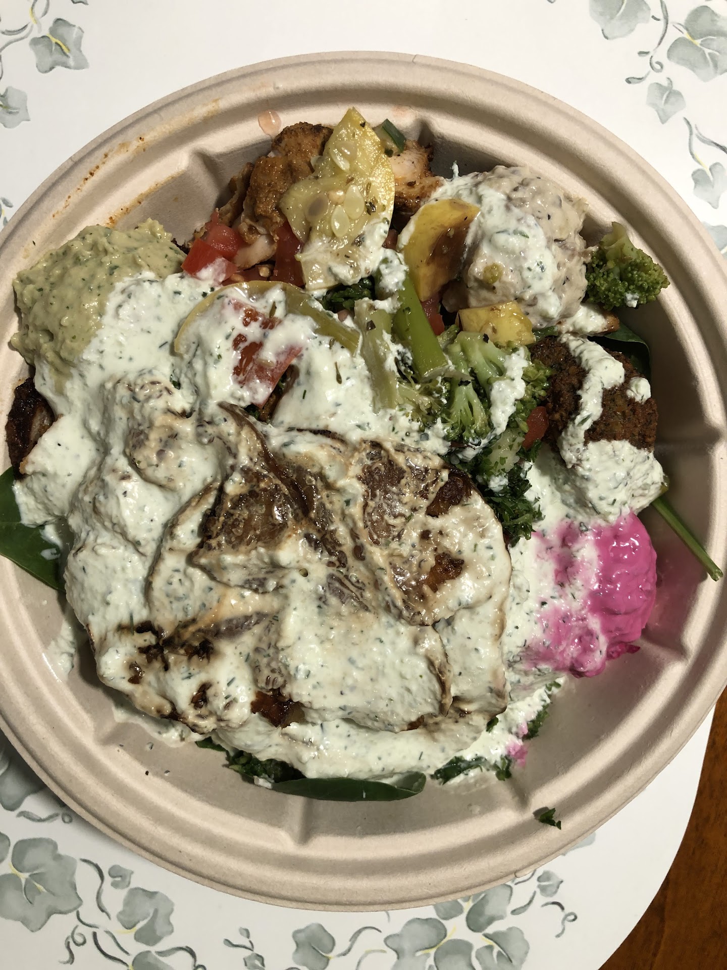This is a "build you own bowl" type of place with one of more base (greens, spinach, rice, cauliflower rice), protean (chicken, lamb, falafel, steak) and a TON of toppings to choose from, the most I've seen of any place like it. You can also get it in a pita or wrap.