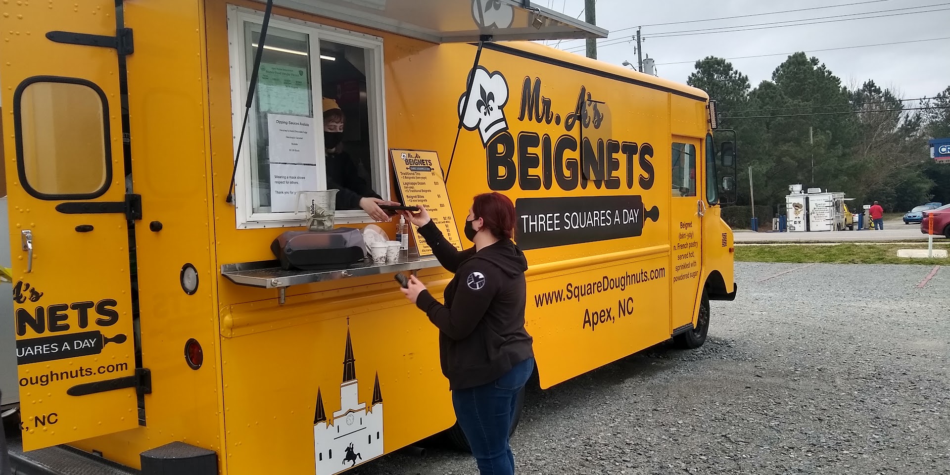 Read moreThis truck has visited our neighborhood more than once--and we love it! The beignets are made fresh and come out VERY hot as you would expect for something that was just fried. They are covered in powdered sugar and are delicious! You can buy three for $5 or thirteen for $20. For $1, you can add a dipping sauce fudge or caramel. They also sell chickory coffee, hot chocolate, and I think Coke products. The staff working the truck are unfailingly kind and courteous. In this time of pandemic, Mr. A's coming to our neighborhood is a real bright spot for us. This is a small business we are delighted to support, and we hope they continue to visit our neighborhood! I only wish I had a picture to post, but alas, we ate them...