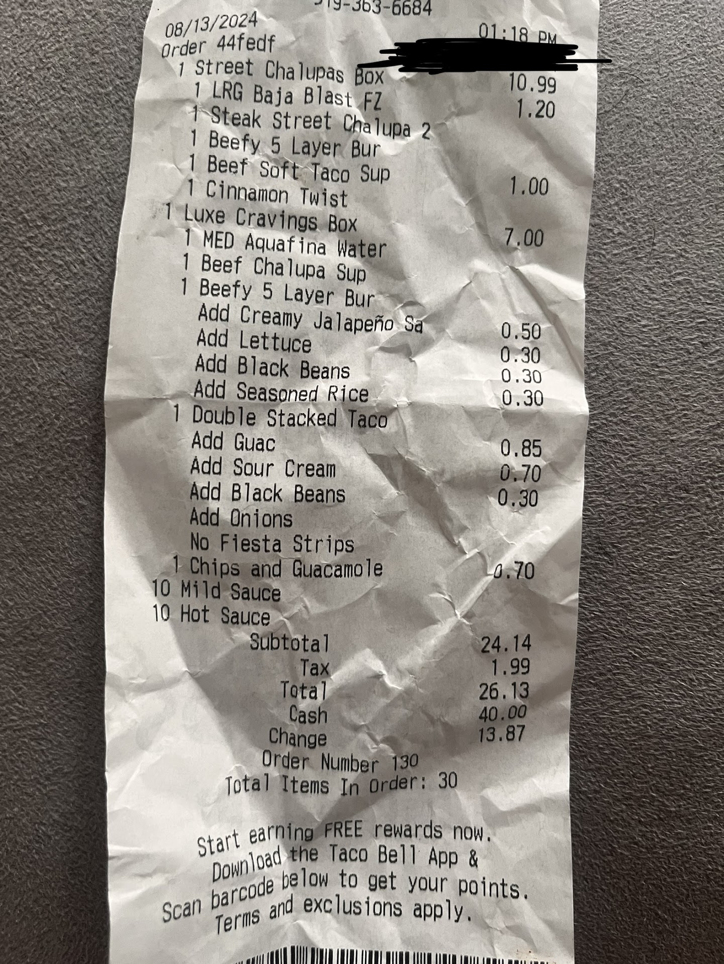 Read moreI don’t usually ever bother to leave reviews but this time was an exception due to how bad the service was. We started off at the drive through and half way through our order being taken, was told something was wrong with the system and we would have to order inside. Inside, we placed our order on a self order kiosk (we could order through their ticketing system but theirs was down?). I then waited 20 MINUTES for our order without my name being called. I eventually got impatient and asked them if my order was ready and they asked around and pulled a bag from the side counter saying if this was it. I had to reconfirm our order and name and asked why they hadn’t called my name. They said they had but I doubt this as neither of us had heard it while waiting. I understand that working at fast food places can be strenuous and chaotic but I think we were more than patient. At this point we get our drinks and food and go back to our home, and come to find I’m missing an entire burrito from my order, the guacamole for my chips, and two whole tacos from her meal! For reference we’d gotten the Street Chalupas and Luxe Cravings boxes. They’d also forgotten to put in pretty much all the add-ons to the food we did get. There was many other small things like delays or quips that I’m not gonna bother to detail out. Just overall, this was an extremely time consuming and frustrating ordeal when this should be a fast food place, not a sit down restaurant. The food we DID get was decent, and I do want to add we’ve ordered from here before with minimal issues in the past so hopefully this was just a...