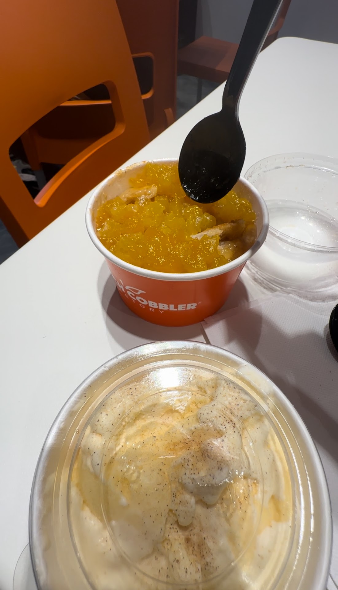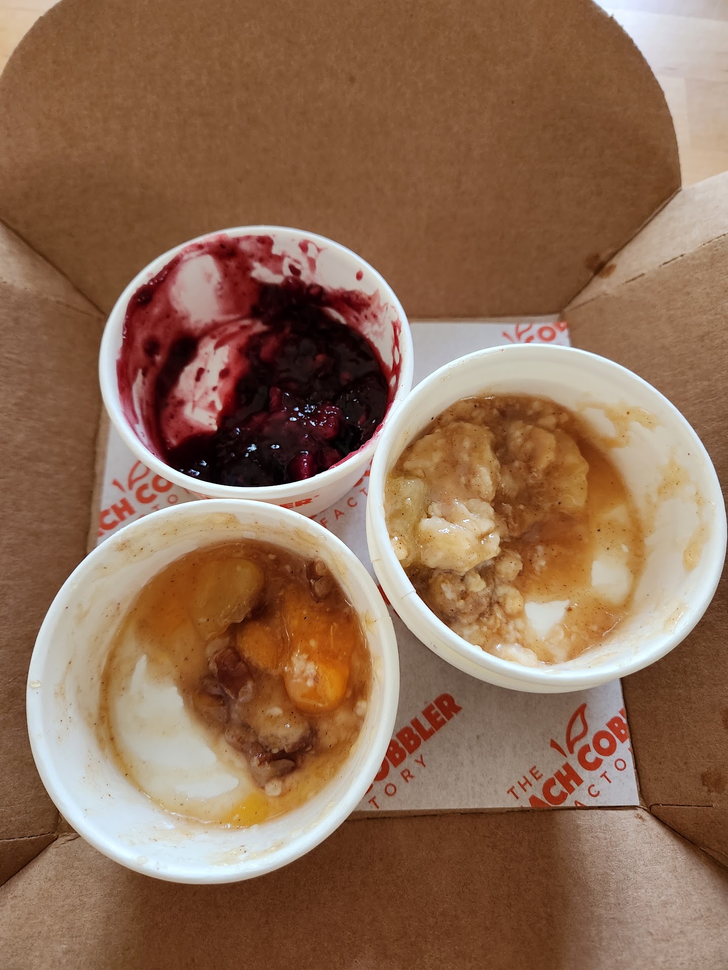 Ā Ā Ā Read moreWe were disappointed about this franchise, having coordinated with friends to dessert here. Location seemed understaffed, possibly 1 person taking order at register and another 1 person in the back fixing up the items. Cobblers all lacked crust/baked texture, some wadded flour clumps, 80% pie fruit filling. Had Peach Cinnamon Pecan, Caramel Apple, Cherry Cordial, and Blackberry. The Cinnamon Roll was okay. But everything was over-priced and over-complicated with menu for $3.99-8.99 a small portion. Think the desserts @Golden Corral are more satisfying. Only the Butterfinger Banana Pudding even seemed from scratch. Their Peachy Tea was like Lipton with heavy canned peach syrup, yet it was "made fresh from scratch". It's a "no, thank you" from all of us for our sweet cravings. Perhaps, this franchise will take a cue from Rise Biscuits for higher quality in offerings and better service. Even utensils for eating on site, and lids on a to-go order had to be requested, which then entailed another 20min wait. Only positive was the option of "flight of cobblers/puddings" at $17.99/4 mini servings; however, just 1 single vanilla ice cream scoopš«¤. Skimpy business. Photo does not reflect all our orders bc we traveled 25mi, so worn...