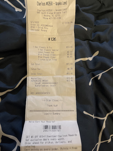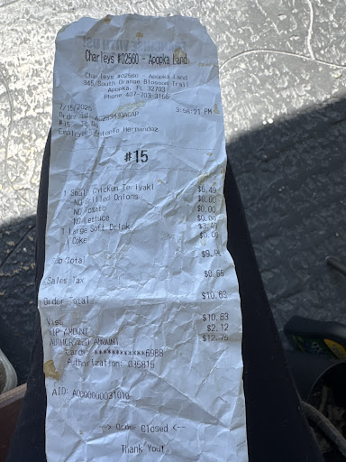 I went to the Charleys in Apopka land Store #02560. 845 South Orange Blossom Trail Apopka FL 32703ā¦..So I went in this location today and was helped by ROXANA and GIL (supposedly the store manager)ā¦.When I went to t this location today I went to the drive thru where all the other customers that were in line before me werehanded the card reader to tap their card and choose the tip amount⦠when it came to my turn ROXANA took my card and did not let me tap it myself and put in tip. When I was about to leave I thought that was funny so I asked for my receipt and she had to go get it. I pulled over to check my receipt and noticed it was $12.45 which was fine until I got the notification that I was charged $14.94. I went back to the location and showed Roxana the discrepancy in which I was charged and she kept telling me I was only charged $12.45⦠Long story short it took 1 whole hour for me to get the return for $12.45 even though my bank has $14.94. The store manager GIL called the cops on me because I made Roxana cry??? I showed the cops my bank account and also what I was charged in the receipt because GIL tried to get me trespassed because they got caught stealing tips!! I have disputed the charges with my bank and also filed a report with the BBB because this was not the first...