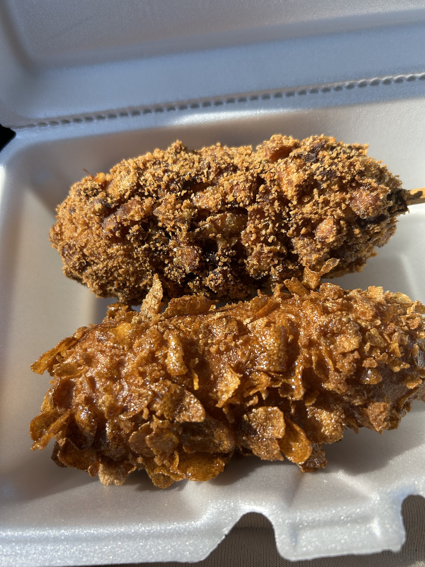 I decided to order two Korean corn dogs instead—specifically the original mozzarella cheese ones, as listed on the sign. I clearly said “original cheese,” and she repeated it back. I asked how long it would take and was told five minutes. I waited in my car a bit longer than that, went back in, picked up the order, and drove 30+ minutes home.