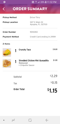 Read moreMy friends and I went to this taco bell a few hours ago, it was after 11pm and the lobby was closed so we had to go through the drive through. I had put in an online order for a taco and a mini quesadilla without chipotle sauce, the taco was a free T-Mobile Tuesdays redemption (see picture) Note: The order was ordered and paid for online. Upon arriving at the speaker we tried to explain that we needed to do 2 separate orders and would like to pick up my online order, however we were told only 2 orders aloud in drine through forcing us to then circle to the back of the line just to pick up my online order after getting the other 2 orders. Onced we finally made it back to the window, I was greeted by the manager who told me only a portion of my meal was paid for and I still owed $1.29 (the cost of the taco). I tried to explain it should have been discounted off, and that my recipe show paid in full, however she interrupted 3 times before i could actually make a full sentence. she just kept repeating "you only piad $1.15 you still owe $1.29." while pointing at the screen that was impossible for me to see. Even after I showed her 3 different receipts, (1 from the app and 1 that was sent as a text confirmation receipt), confirming the the order was paid in full, she refused to give me the taco. On top of all that, the mini quesadilla was made with chipotle sauce, making it inedible to me. When I brought that to the managers attention I was told: "you are holding up my line and need to leave." and was refused a refund.