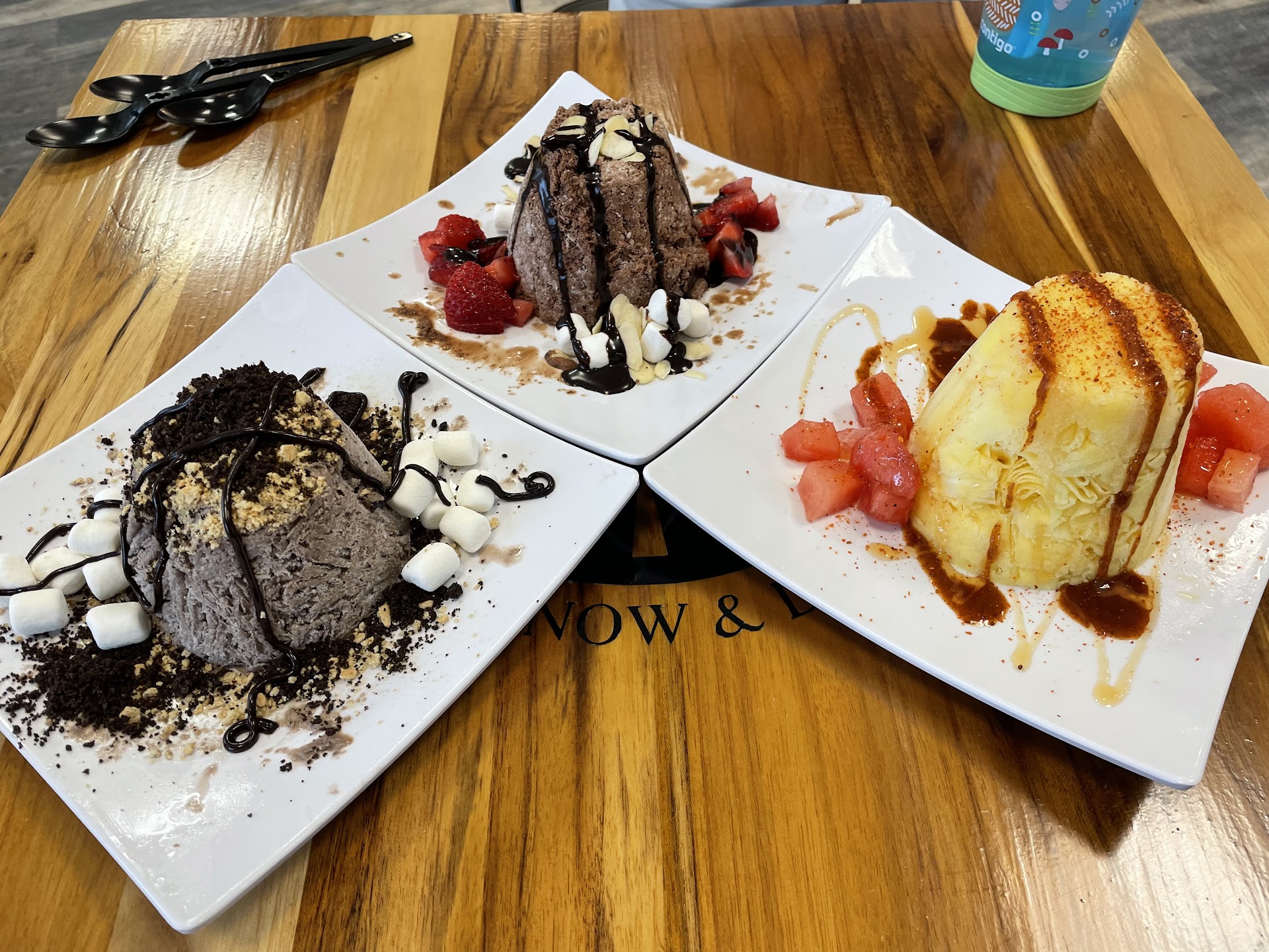 Read moreExcellent desserts! Well worth the extra money. I was reluctant to try this because I didn't think that shaved ice would be this good. I was thinking that it wasn't going to be much more than just a slushy. I could not have been more wrong. They freeze the dessert mix before shaving it. When you take a spoonful the desert crumbles a little like a very soft and moist cake. The mouth-feel is like a cross between ice cream and cotton candy. It's creamy and smooth like gellatto, and not icy or crunchy at all. It is really unique. You actually savor each bite. The base flavor is like a sweet vanilla, but they make it to your choice. There are lots of options. I had the peanut butter and added Twix toppings. Great combination. Excellent experience. Both my son and I enjoyed our desserts very much. The young lady working there was very kind and helpful. Excellent service! I felt like I was eating at a high end restaurant. The desserts were served on plates and the presentation was amazing. I highly,...