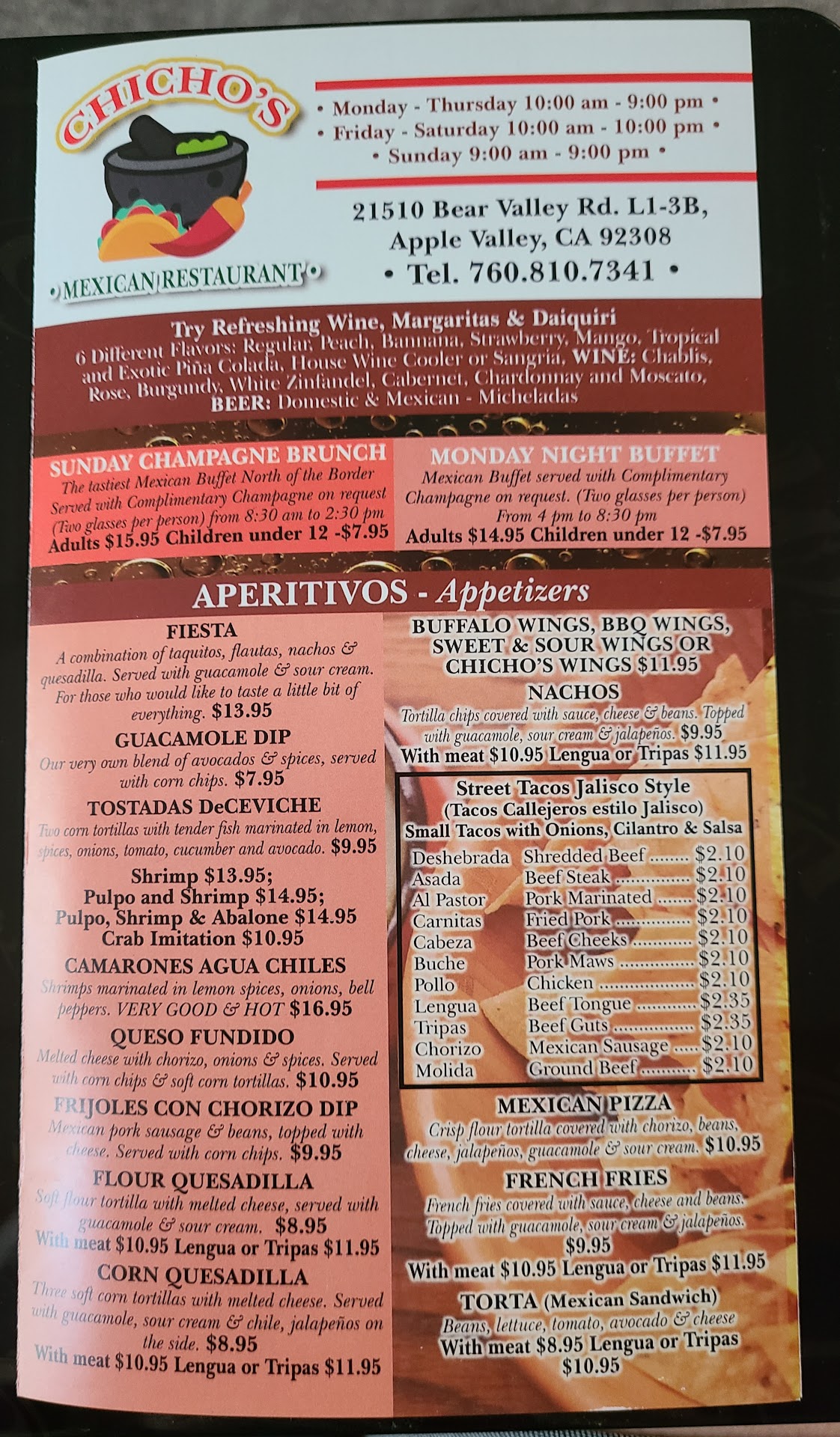 Read moreVisited this restaurant for the first time today. I had been checking out the reviews and they were pretty much perfect! So I finally went and it did not disappoint. The service was phenomenal from the moment we were greeted. Chicho took our order and he was very welcoming, helpful, and professional. He helped us with the menu and answered our questions to our satisfaction. Then came the food, and it was delicious. We ordered the special of the day which was a Jr. Burrito. But don't let the Jr. fool you into thinking it's a small burrito or a kids burrito. This is a large burrito with Chile Verde pork in it. They also add rice, onions, and chilies. It comes wet with a light orange sauce on top, and smothered in cheese. Very tasty and delicious!