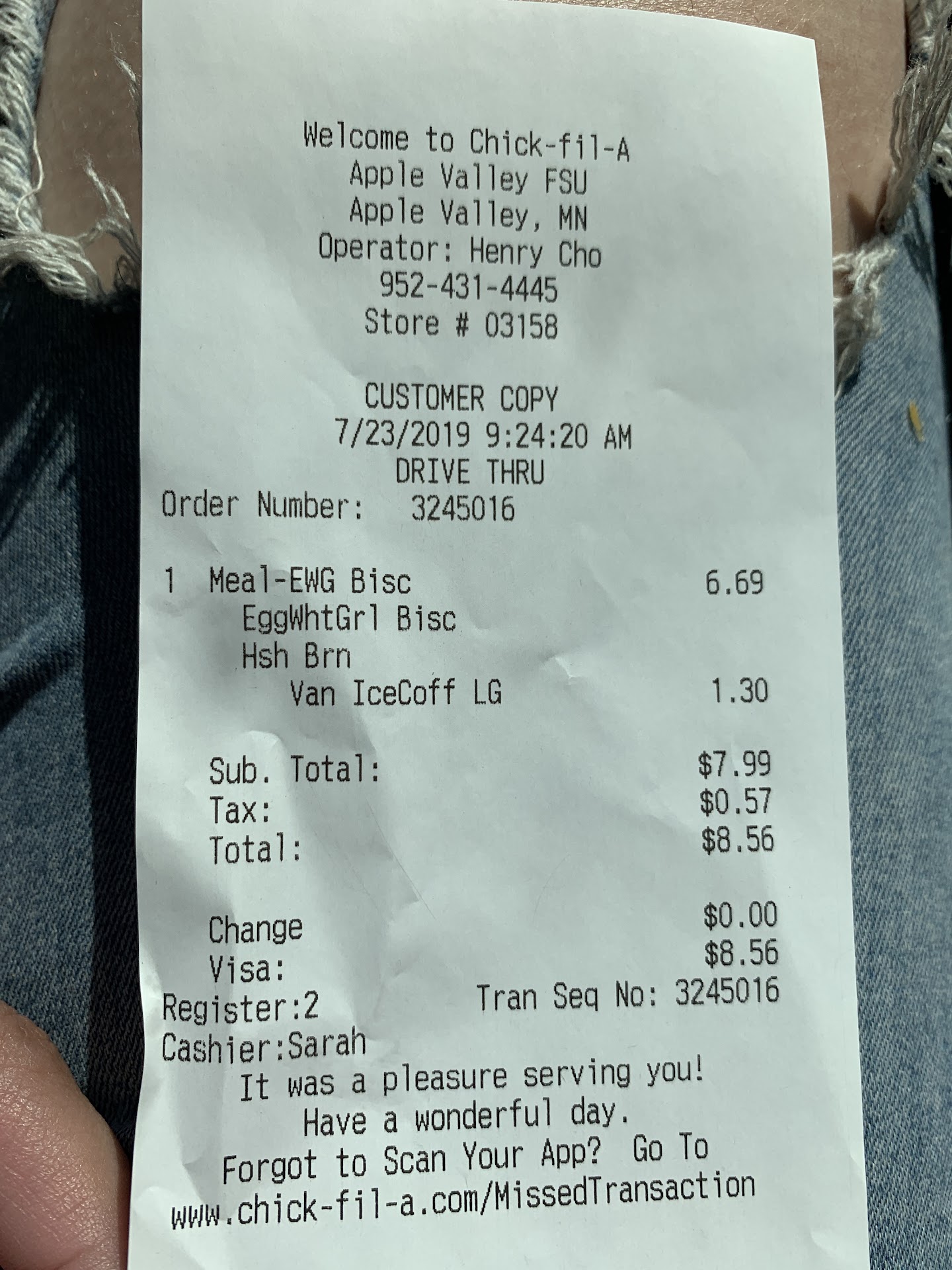 Read morei'd like to preface this with the fact that i can not post this anywhere else, it seems chick fil a only wants my feedback when they are prepared to give me a free sandwich for it. so tonight my family and i decided we wanted chick fil a, so i ran out to grab it. as i pull into the lot, i notice that employees have pen and paper and are writing down - what i can only assume are drive thru orders. so i decide that would take twice the time it would to just come in and order to go but boy was i wrong. get in there, and to my surprise its 6:50 on a tuesday and its basically dead, maybe 5 guests in the restaurant and 1 waiting for a to - go order. so i place my order and my cashier, "Candi" (i believe her name tag refereed to her as a shift leader or something of the sort). decides to make the 4 lemonades before taking my money for the order (not a huge deal but could be a bit more efficient). once i pay and have a seat i sit from 6:52 until 7:12 (20 mins) until i check up on things. i ask my cashier candi if she knew how much longer it would be on my order and she runs back to the kitchen to check, meanwhile an older employee walks by and only says "well i have nothing on my screen". a younger gentleman approaches me and asks for my receipt which i promptly hand him. no further explanation is given to me regarding the status of my order. another 5 minutes roll by and my meal is finally ready. candi apologizes for the wait and hands me 2 free chicken breakfast sandwich coupons. coming from a food service management background i understand things like this happen but 20 minutes? if someone waited 10 minutes at my restaurant i would have offered them a refund for their order. and no explanation given? first words that come out of my mouth would have been i'm sorry, followed by some sort of explanation as to why i spent half an hour at waiting for a to go order at a fast food restaurant. and two breakfast sandwiches? you cant even order those after 11am and i came in at 7 pm. all in all this has to be the worst experience i've had at a fast food restaurant and i think it reflects horribly on the stores management and leadership. its going to be awhile before i stop by chick fil a of apple...