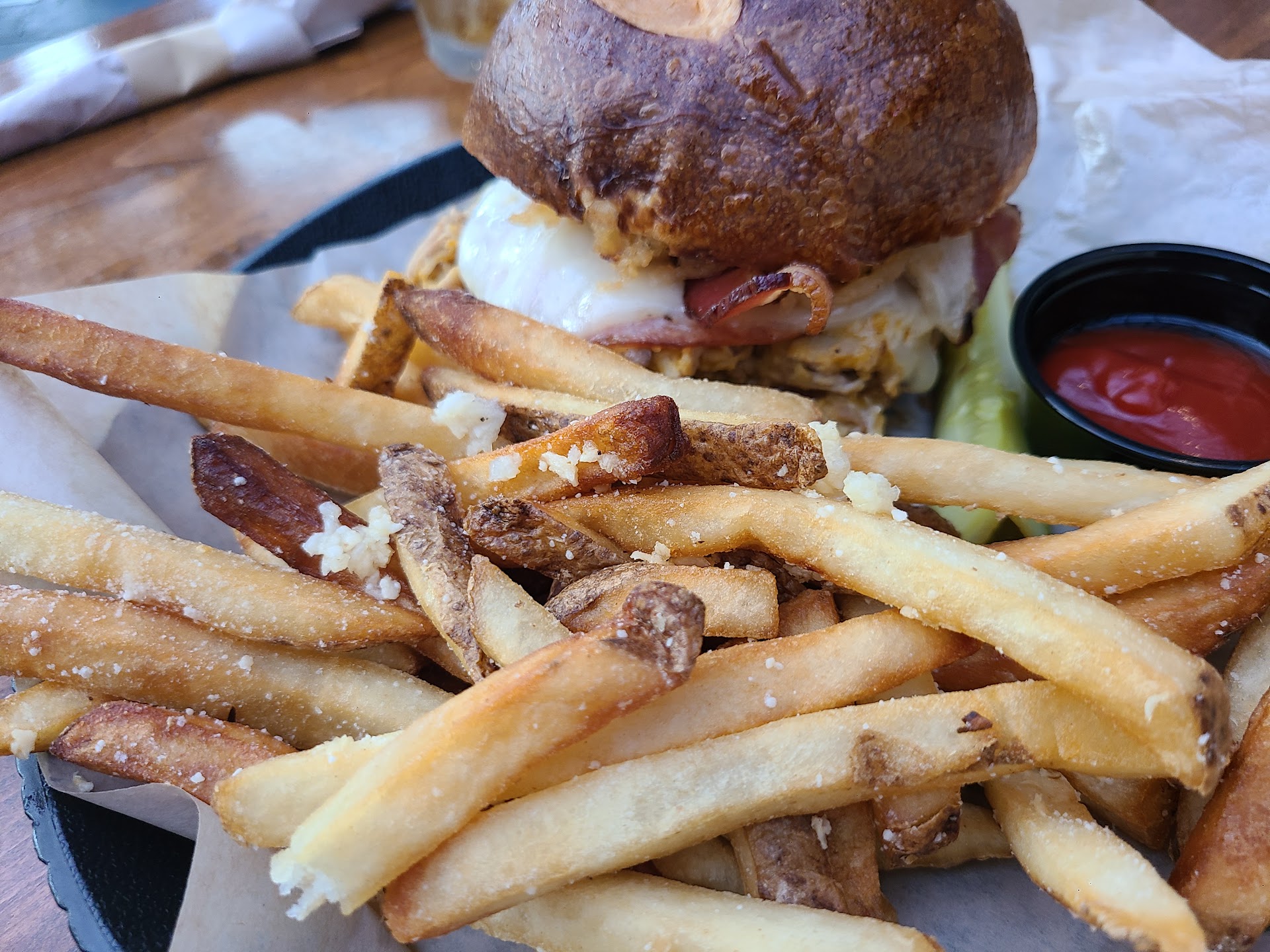 I started to dig into my juicy and was really looking forward to tasting this thing. Prepared by stuffing it with creamy beer cheese and served on a pretzel bun, topped with bacon, bistro sauce, haystack onions, and a slice of pepper jack. Sounds good, right? It had potential, but like their French Onion Soup, ZERO CHEESE to be found inside. Essentially, I had a large bacon & pepper jack cheese burger with an air pocket in the middle. Check out the Juicy Lucy Challenge to see how they did against the competition. Hint, not so good!