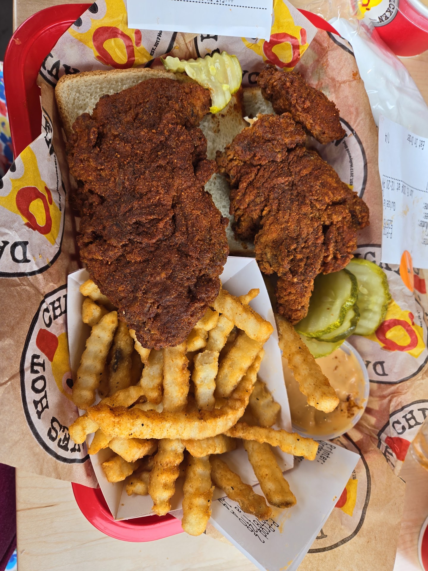The food was pretty good. Sadly I have absolutely zero spice tolerance, so I was glad to see that No Spice was an option. The chicken tenders were LARGE and cooked well - crispy outside and juicy inside. I found the flavor of the chicken to be pretty bland on its own, which leads me to believe that they rely on the sauces for most of their flavor. They were best dipped in the Dave’s sauce (which is sweet and tangy) or honey. I also felt like the Mac and cheese was really underwhelming. The noodles were too soft for my liking and they were drowning in cheese sauce. No real cheese or much flavor. Not a side that I would personally re-order. The fries, on the other hand, were very good! Crispy, even after a 20-minute drive home, and nicely seasoned. I also liked that you could order a large side of the pickles!