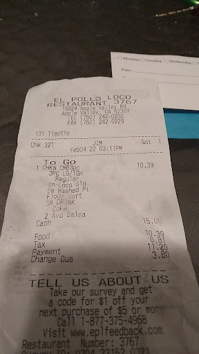 I will never eat at an El Pollo Loco again. $3 for a bean rice and cheese burrito and $2.50 for a tiny and very dry Taco al Carbon. Came to $5.90, I will be going to Del Taco from now on, same amount of food for $2.16 and way...