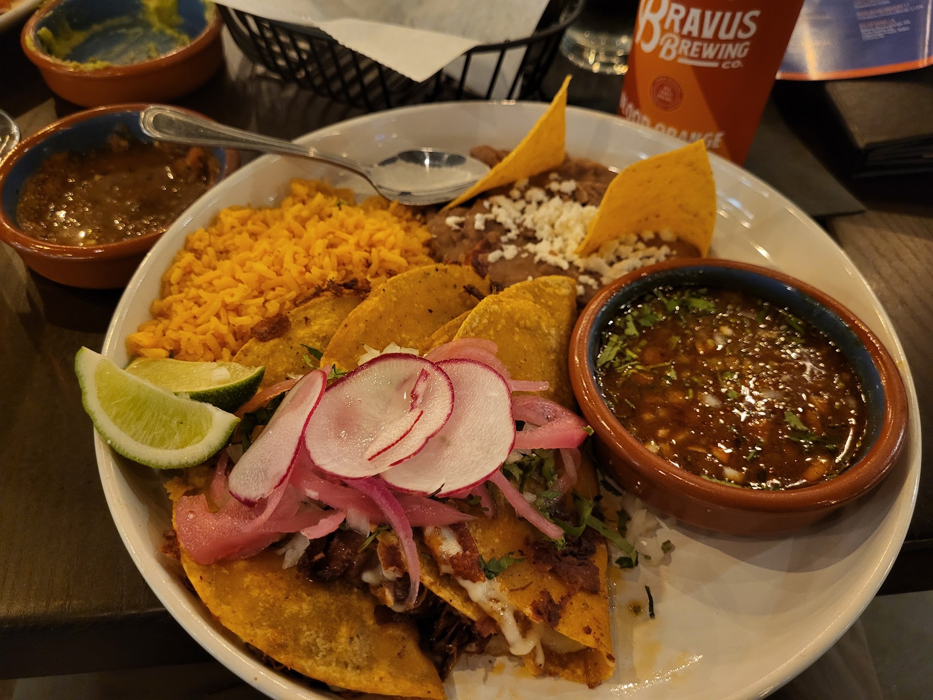 There were a couple of food issues that were a surprise in a negative way, not enough to dampen the night, but enough for management to know about, so I’ll share them with you: the pork tacos, while exceptionally tasty, were so fatty that half of the volume of meat was left on the plate. (Sorry I didn’t take a picture.) I found a chicken bone in the enchilada meat that was probably an inch and a half long, that was nearly a choking hazard for me. (Please, kitchen staff, be more careful.)