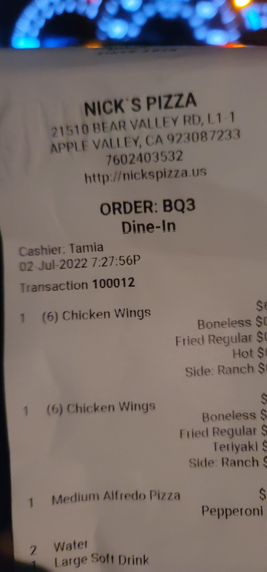 We would order pizza just about every weekend from here. Sometimes adding wings, spaghetti, salad, Nick sticks, etc.....always the Nick's special which is a Supreme and a pepperoni puzza..Sometimes adding sausage pizza ....we picked up wings on one occasion they were burnt to the point we couldn't/wouldn't eat them...called to let the manager know as we live a good 7 miles from here...she apologized and that was it...did not offer to replace them..we just let it go..recently we picked up another order of wings..asked for plain, received barbecued....called the manager she said return them. We will replace it with the right order..drove back and returned them...again recently placed an order for spaghetti...got home and the spaghetti was made with fettuccine noodles!...on another spaghetti order we received it with meat sauce and no meatballs....did not order it that way. By this time I had become frustrated and called upset with the manager and explained to her it seems every week something is wrong with the order and we live far away...I requested if she could have the right order brought to us and that was a definite no!..she said you need to bring it back or I can't help you...wich in the past we had done but we were tired of driving back to have them fix their mistake once again!...she actually argued with me over the phone and brought up "well you didn't pick up an order back in August of 2023"!..(due to accident by the way) What!!!!??......she would not even fathom the idea of crediting the item...she was just abstinent and rude in her manner..(just the item, not the order).....Needless to say, we have stopped ordering altogether from Nick's Pizza...the food was good when made properly, but the customer service is absolutely...